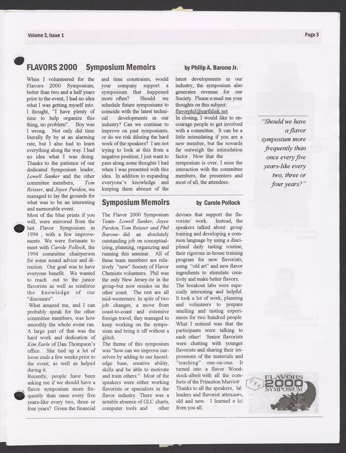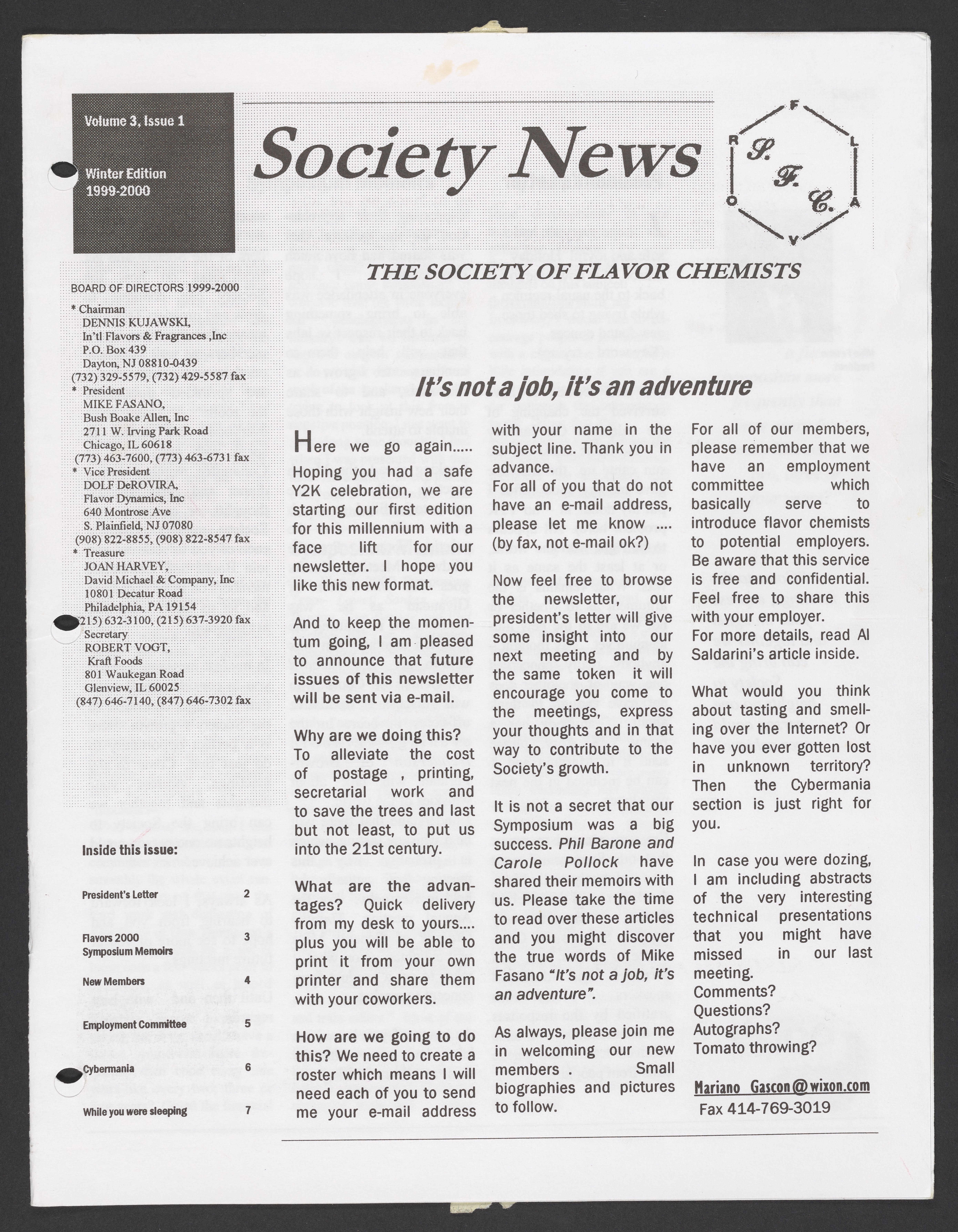 Society of Flavor Chemists. “Society News, Volume 3, Issue 1,” 1999–2000. Society of Flavor Chemists, Society News, Box 1, Folder 2. Science History Institute. Philadelphia. https://digital.sciencehistory.org/works/krwj6ot.