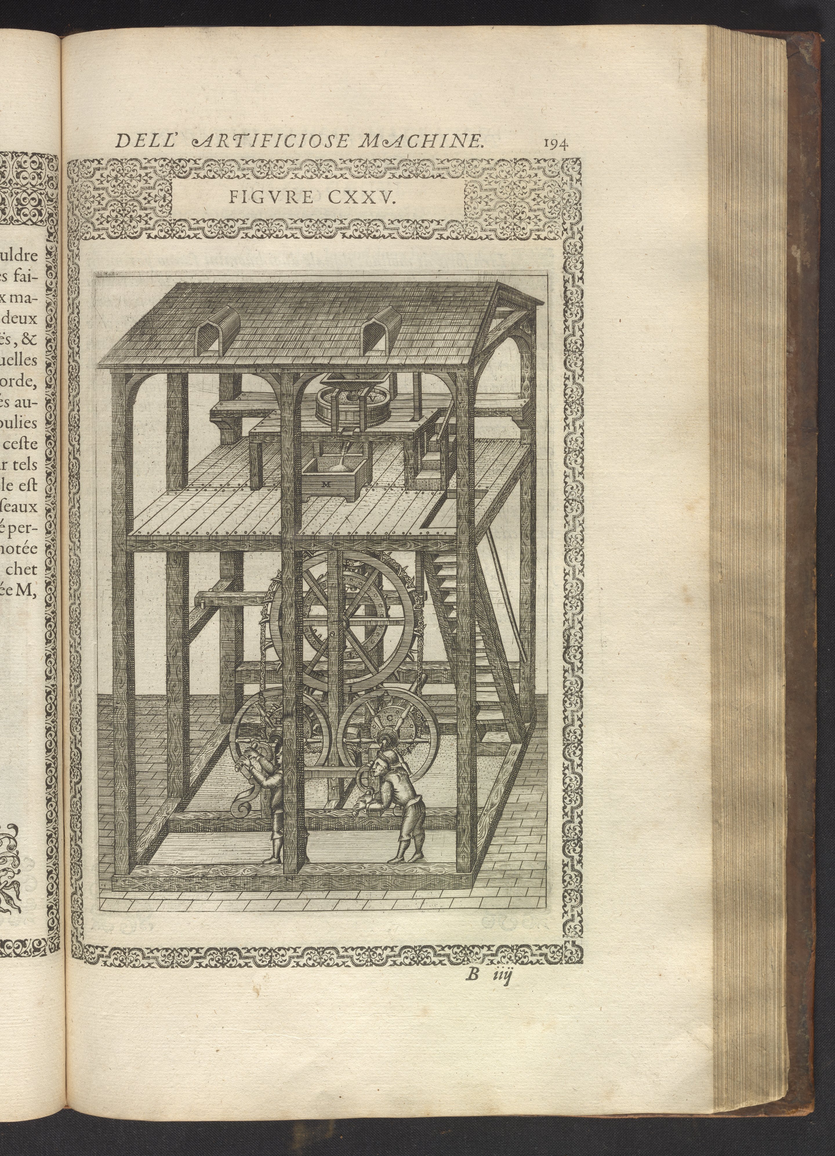 Ramelli, Agostino. “Plate 125: Grain Mill Powered by Two Men.” In Le Diverse Et Artificiose Machine Del Capitano Agostino Ramelli. Paris, France, 1588. https://digital.sciencehistory.org/works/ks65hc35f.
