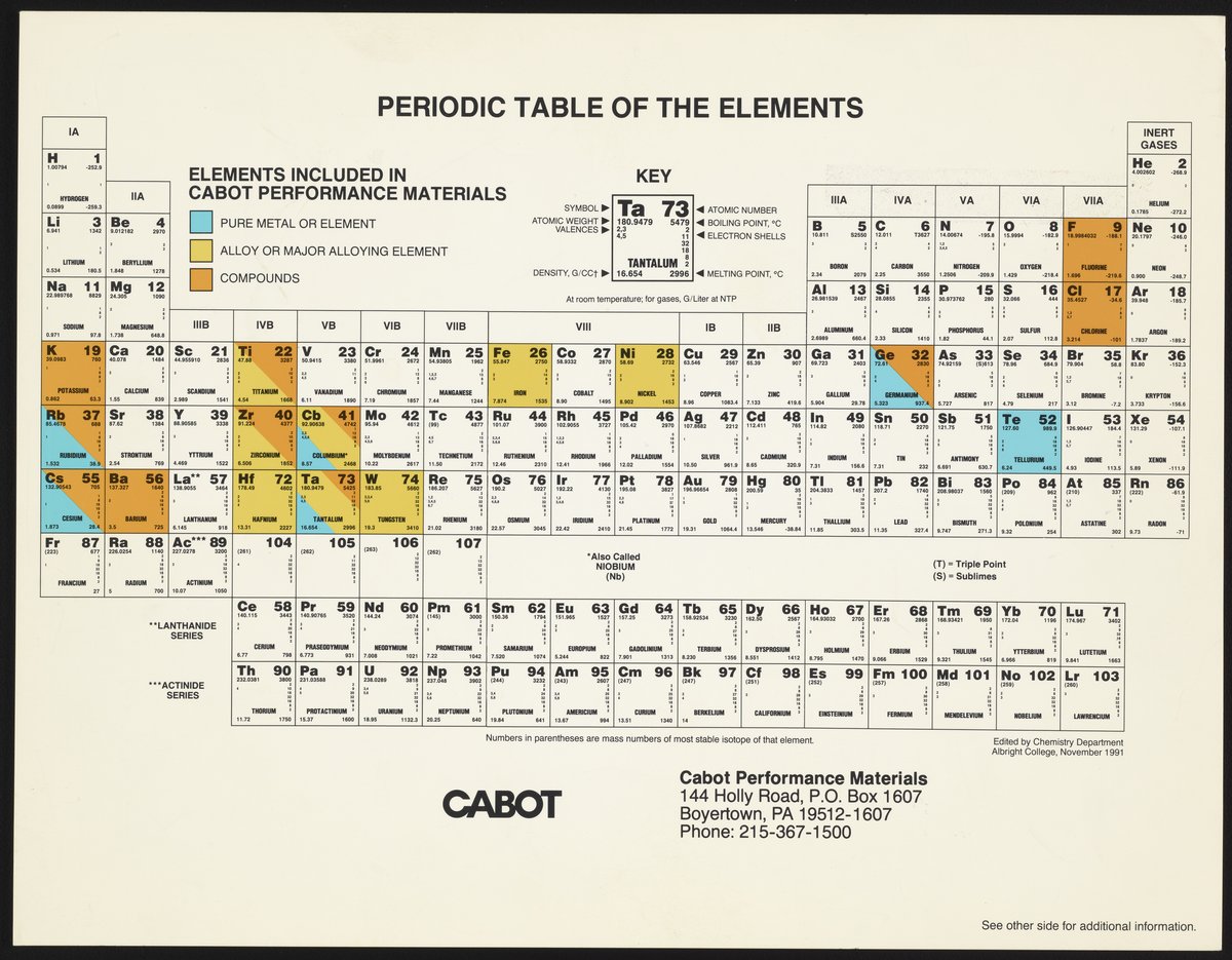 “Periodic Table of the Elements.” Boyertown, Pennsylvania: Cabot Performance Materials, 1991. Periodic Tables Collection, Box FC-5, Folder Periodic Tables (Assorted). Science History Institute. Philadelphia. https://digital.sciencehistory.org/works/ks65hd198.