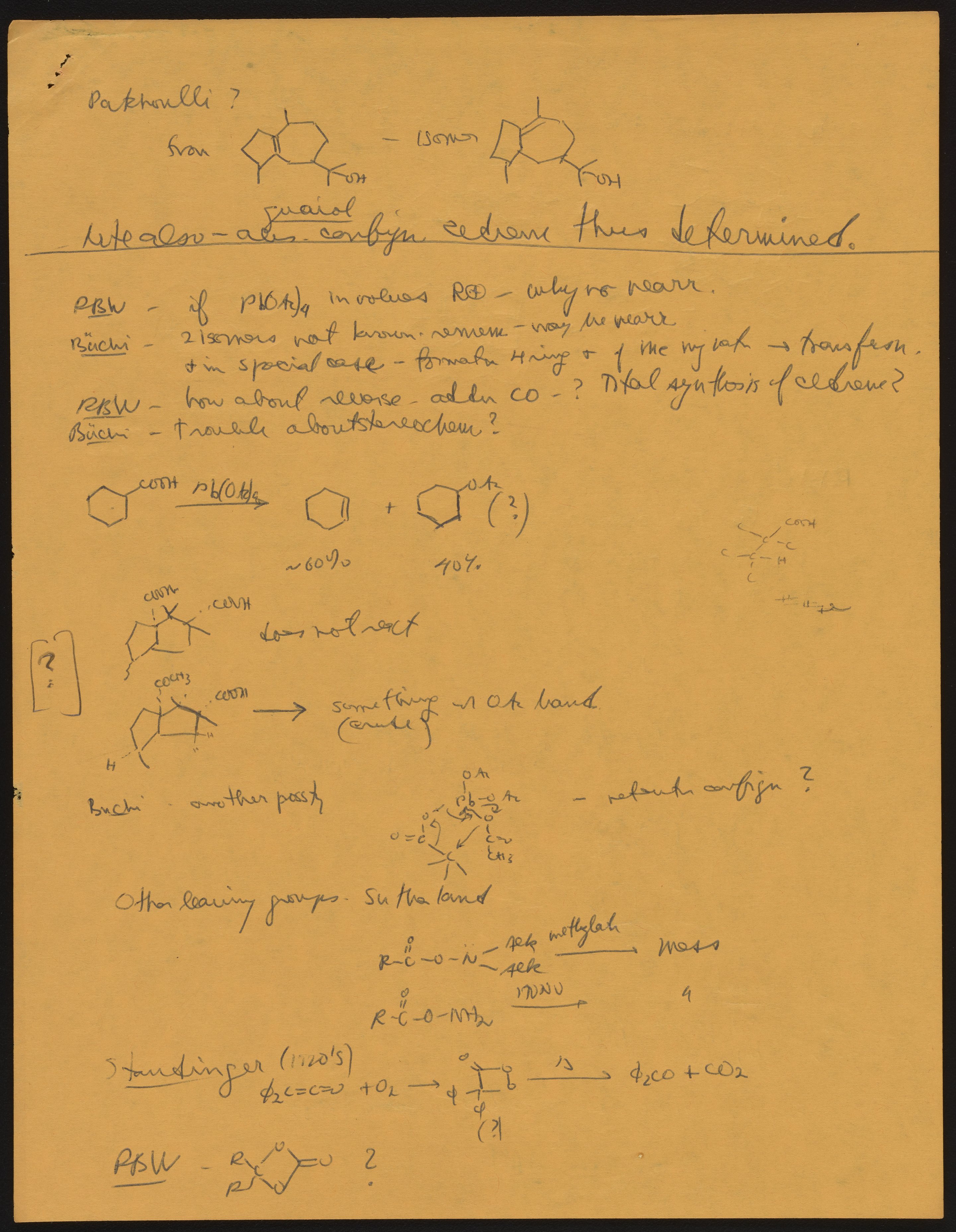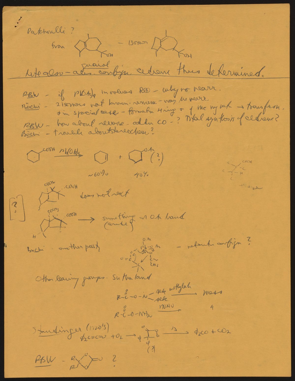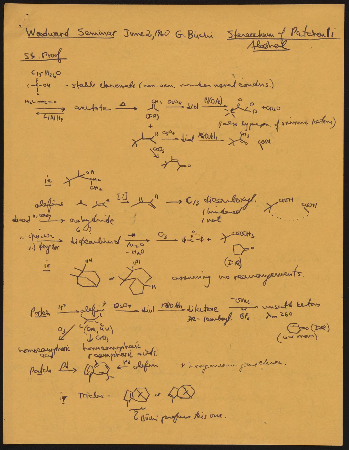 Kohler, Robert E. “R. B. (Robert Burns) Woodward Seminar Entitled "[Stereochemistry] of Patchouli Alcohol.’” Notes from R. B. (Robert Burns) Woodward's Seminars, circa 1959–1966. Folder 2. Science History Institute. Philadelphia. https://digital.sciencehistory.org/works/ks65hd31j.