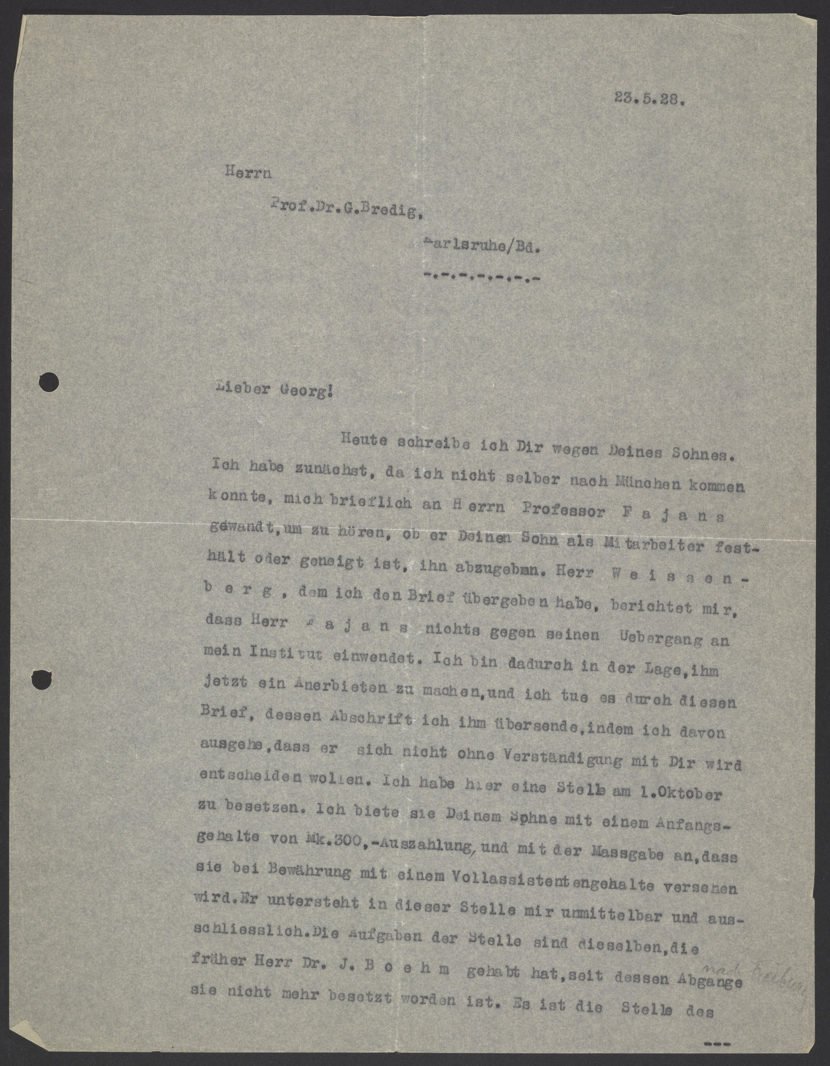 Heute schreibe ich Dir wegen Deines Sohnes. Ich habe zunächst, da ich nicht selber nach München kommen konnte, mich brieflich and Herrn Professor Fajans gewandt, um zu hören, ob er Deinen Sohn als Mitarbeiter festhält oder geneigt ist, ihn abzugeben. Herr Weissenberg, dem ich den Brief übergeben habe, berichtet mir, dass Herr Fajans nicht gegen seinen Übergang an mein Institut einwendet. Ich bin dadurch in der Lage, ihm jetzt ein Anerbieten zu machen, und ich tue es durch diesen Brief, dessen Abschrift ich ihn übersende, indem ich davon ausgehe, dass er sich nicht ohne Verständigung mit Dir wird entscheiden wollen. Ich habe hier eine Stelle am 1. Oktober zu besetzen. Ich biete sie Deinem Sohne mit einem Anfangsgehalte von Mk. 300., - Auszahlung und mit der Massgabe an, dass sie bei der Bewährung mit einem Vollassistentengehalte versehen wird. Er untersteht in dieser Stelle mir unmittelbar und ausschliesslich. Die Aufgabe der Stelle sind dieselben, die früher Herr Dr. J. Boehm gehabt hat., seit dessen Abgang nach Duisburg sie nicht mehr besetzt worden ist. Es ist die Stelle des