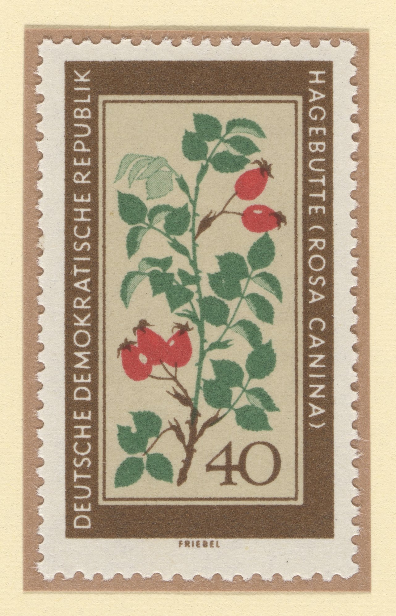 Small JPG1200 x 1866px — 422 KBFull-sized JPG1282 x 1994px — 471 KBOriginal fileTIFF — 1282 x 1994px — 7.3 MB1960 postage stamp from the German Democratic Republic (East Germany) featuring an illustration of Rosa canina, commonly known as the Dog Rose or Rose Hip. Rose hips have high levels of Vitamin C, antioxidants, and fatty acids. It is widely used in tea to boost immunity, reduce inflammation, treat cold symptoms, and support joint health (arthritis).