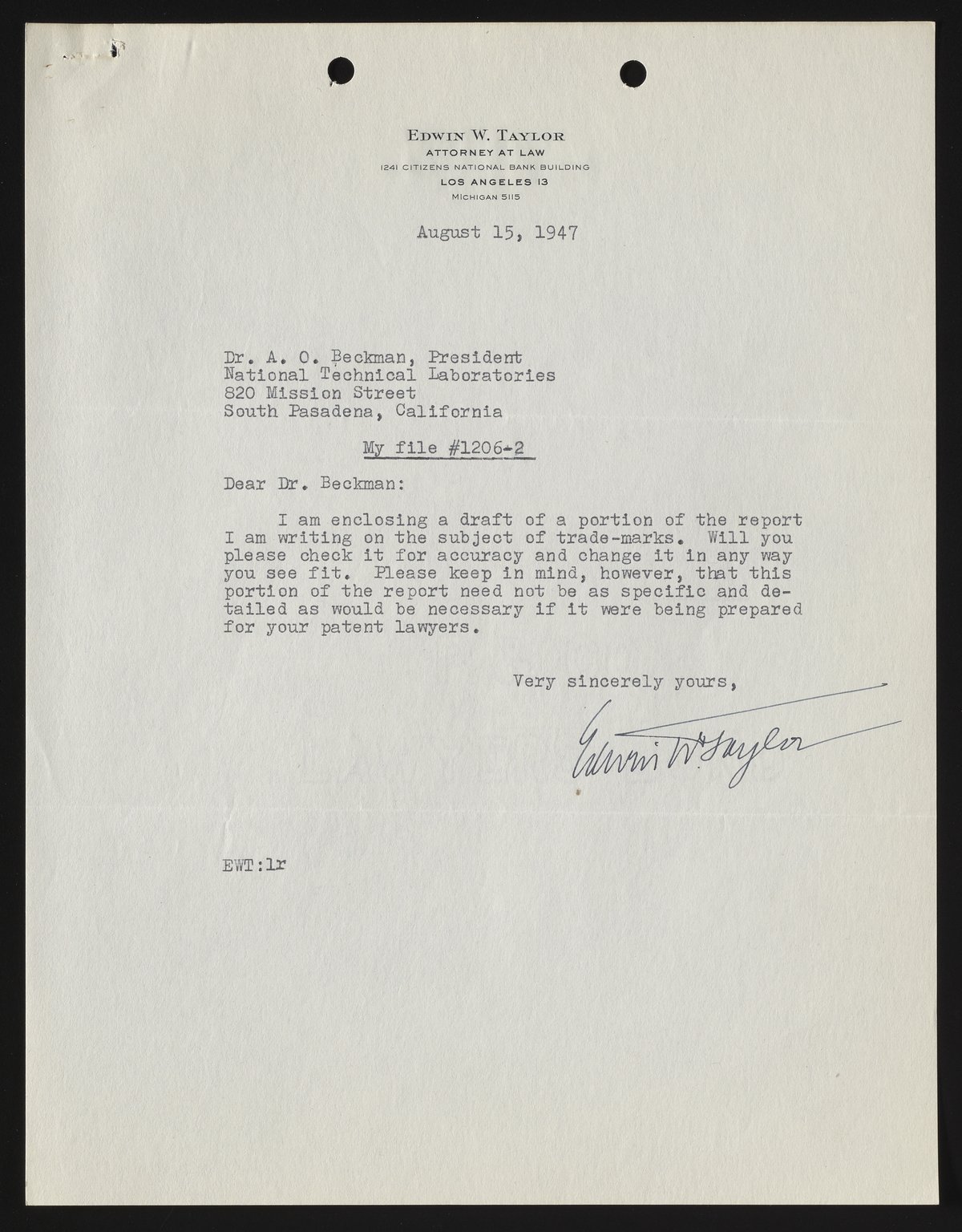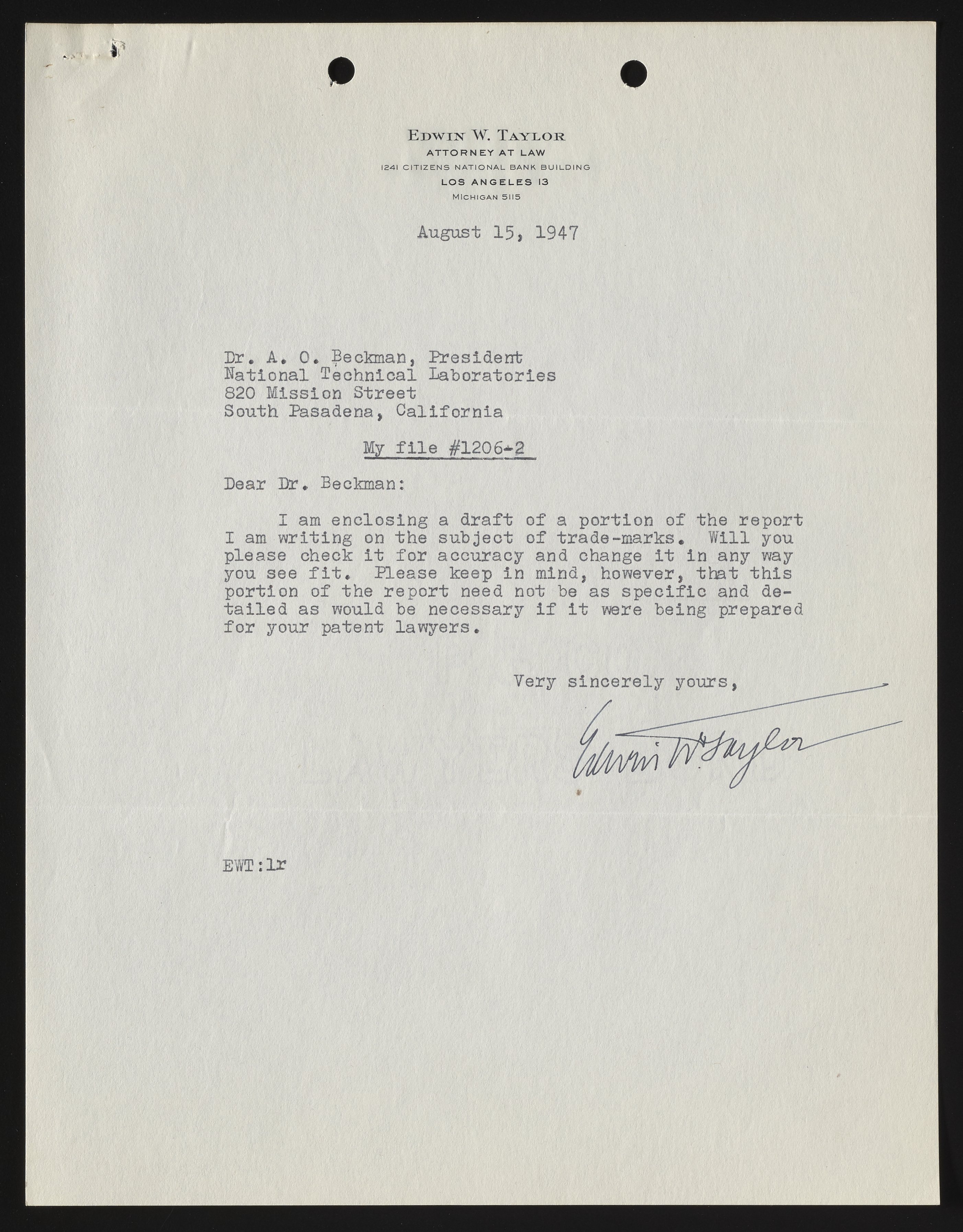 Small JPG1200 x 1536px — 250 KBFull-sized JPG2804 x 3588px — 1.4 MBOriginal fileTIFF — 2804 x 3588px — 28.8 MBThis letter includes a report on existing Beckman trademarks as of 1947, including information on the "acidimeter" and the point at which that instrument became known as the pH meter (1935).