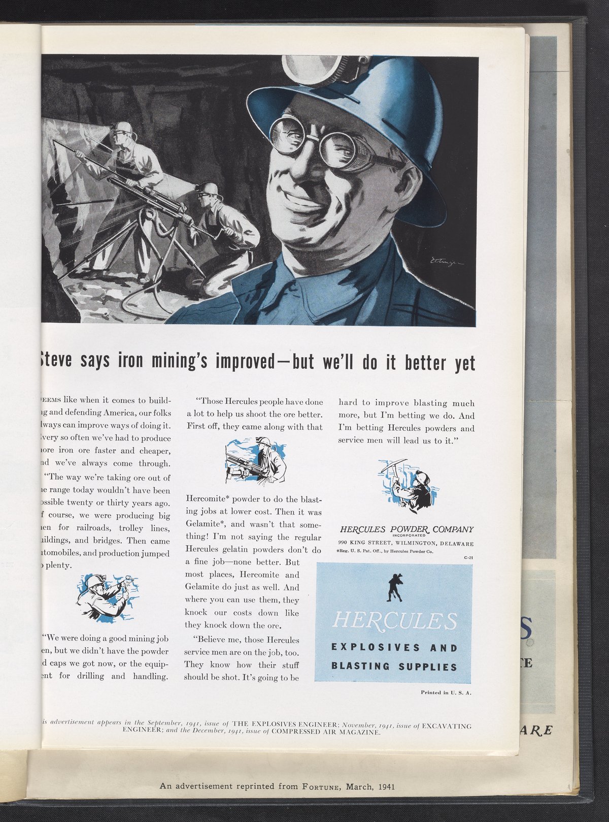 Hercules Incorporated. “Hercules Explosives and Blasting Supplies: Steve Says Iron Mining's Improved - But We'Ll Do It Better Yet.” 1941 Hercules Advertisements, 1941. Records of Hercules Incorporated, Volume 1941. Science History Institute. Philadelphia. https://digital.sciencehistory.org/works/kw52j8997.