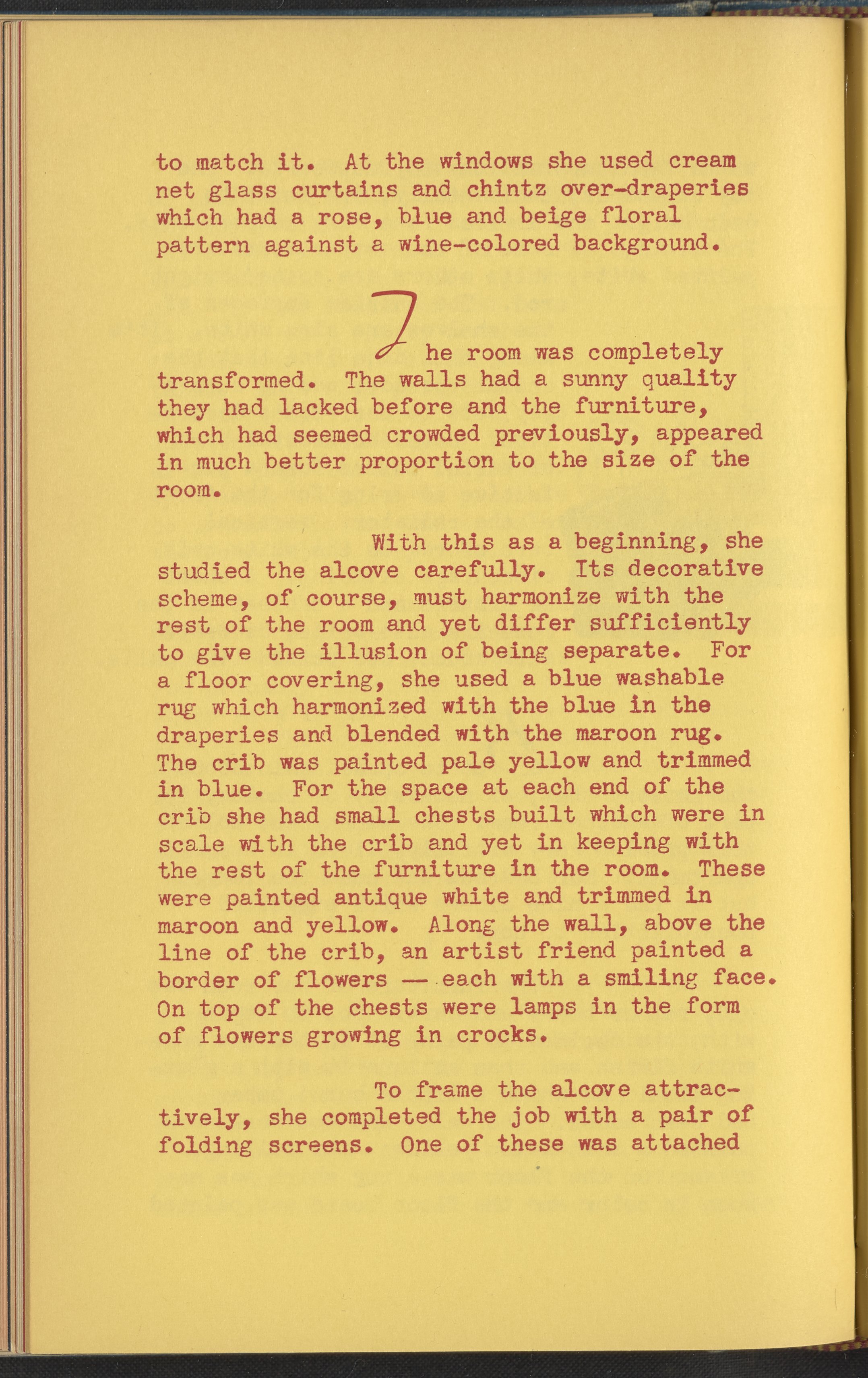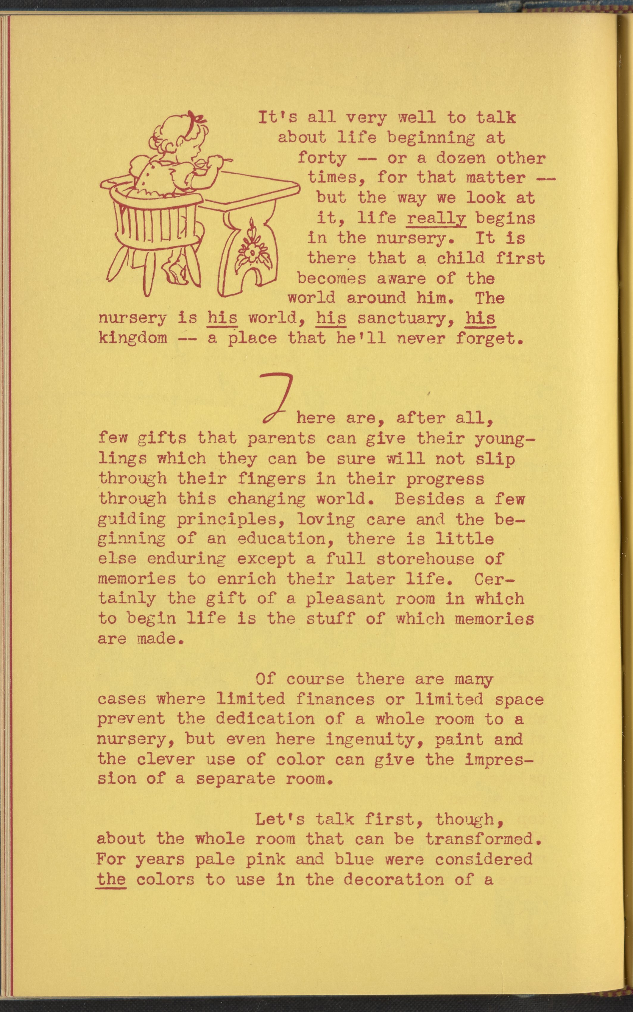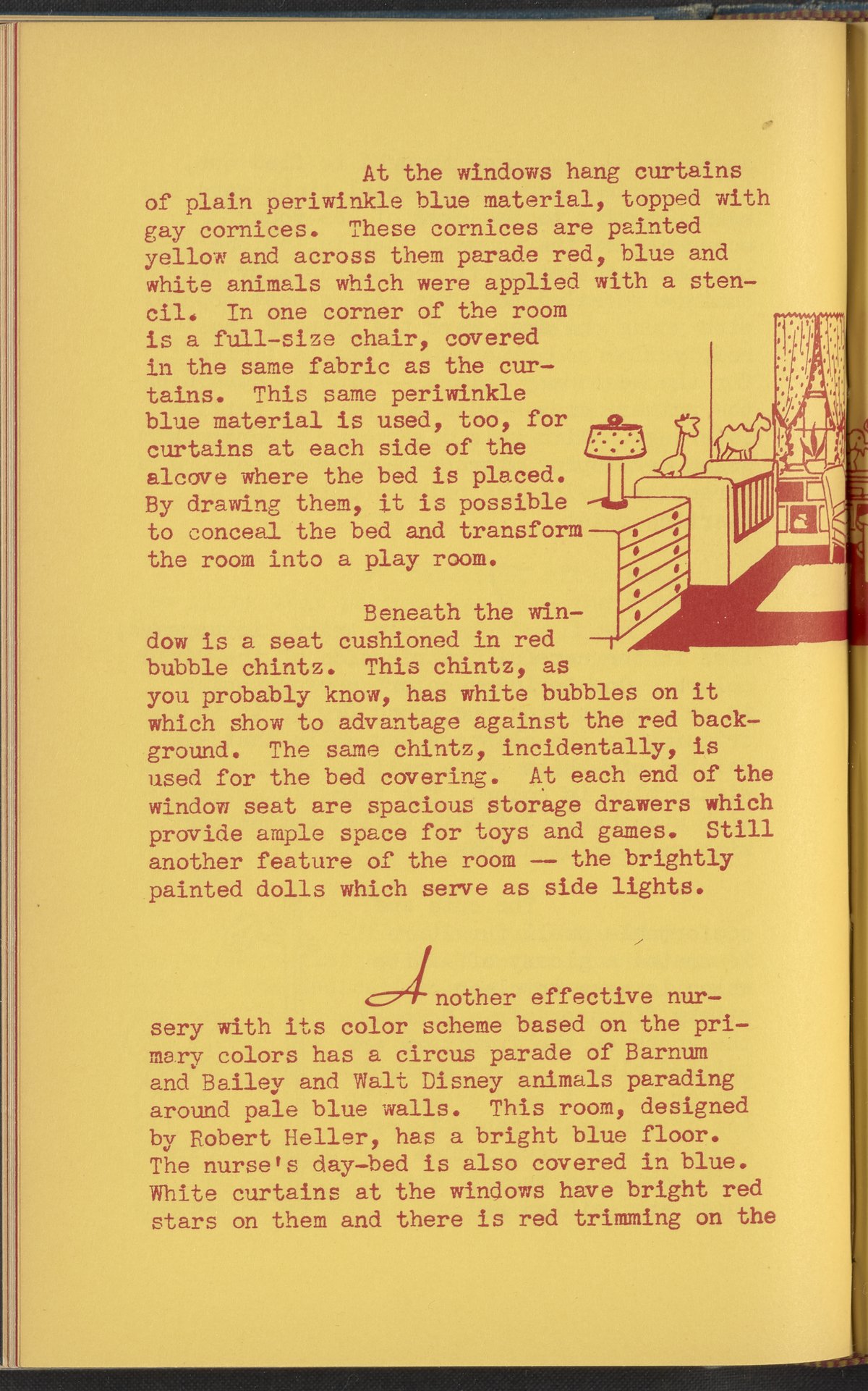 Booklet corresponding to a radio broadcast program created by the National Paint, Varnish, and Lacquer Association. The booklet provides instruction for decorating a child's nursery. Describes how young children prefer rooms decorated with primary color schemes, and describes several nurseries for inspiration. Includes small stylized illustrations throughout and decorated covers.