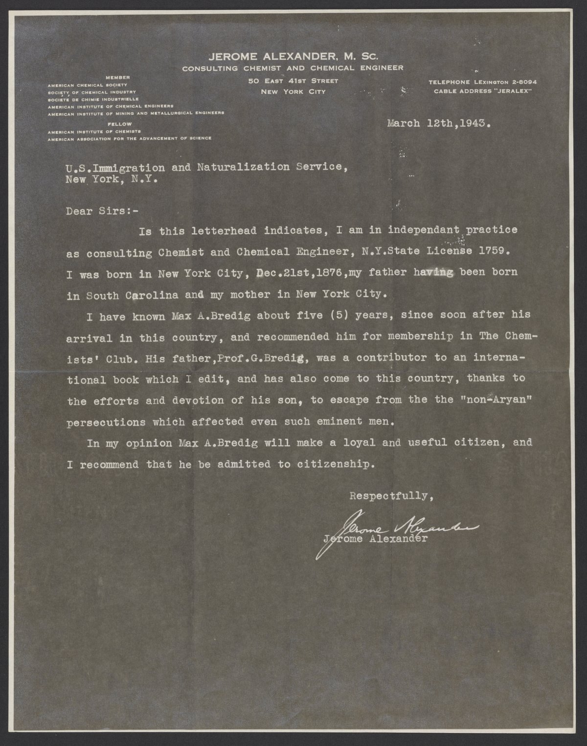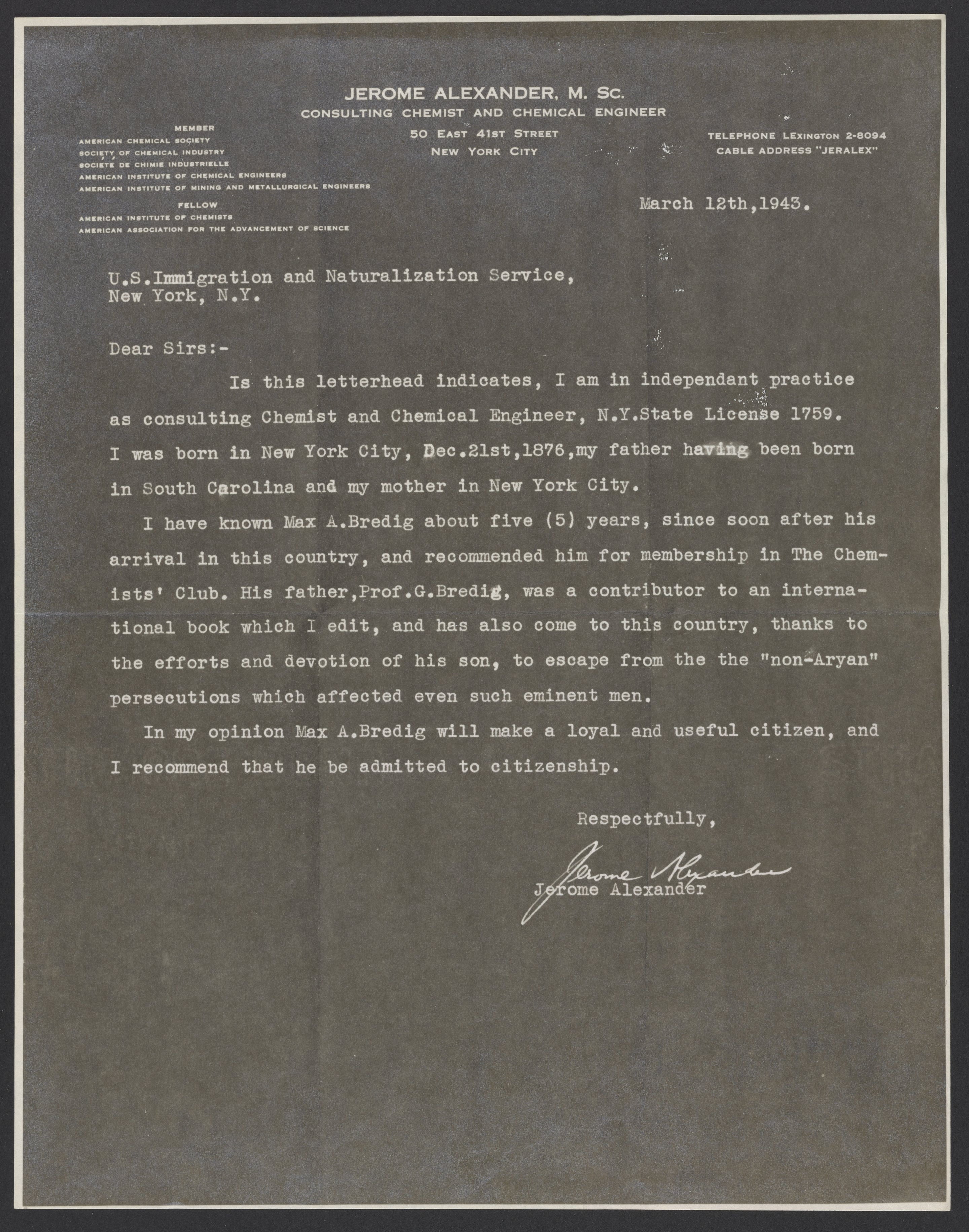 Letter from Jerome Alexander to the U.S. Immigration and Naturalization Service