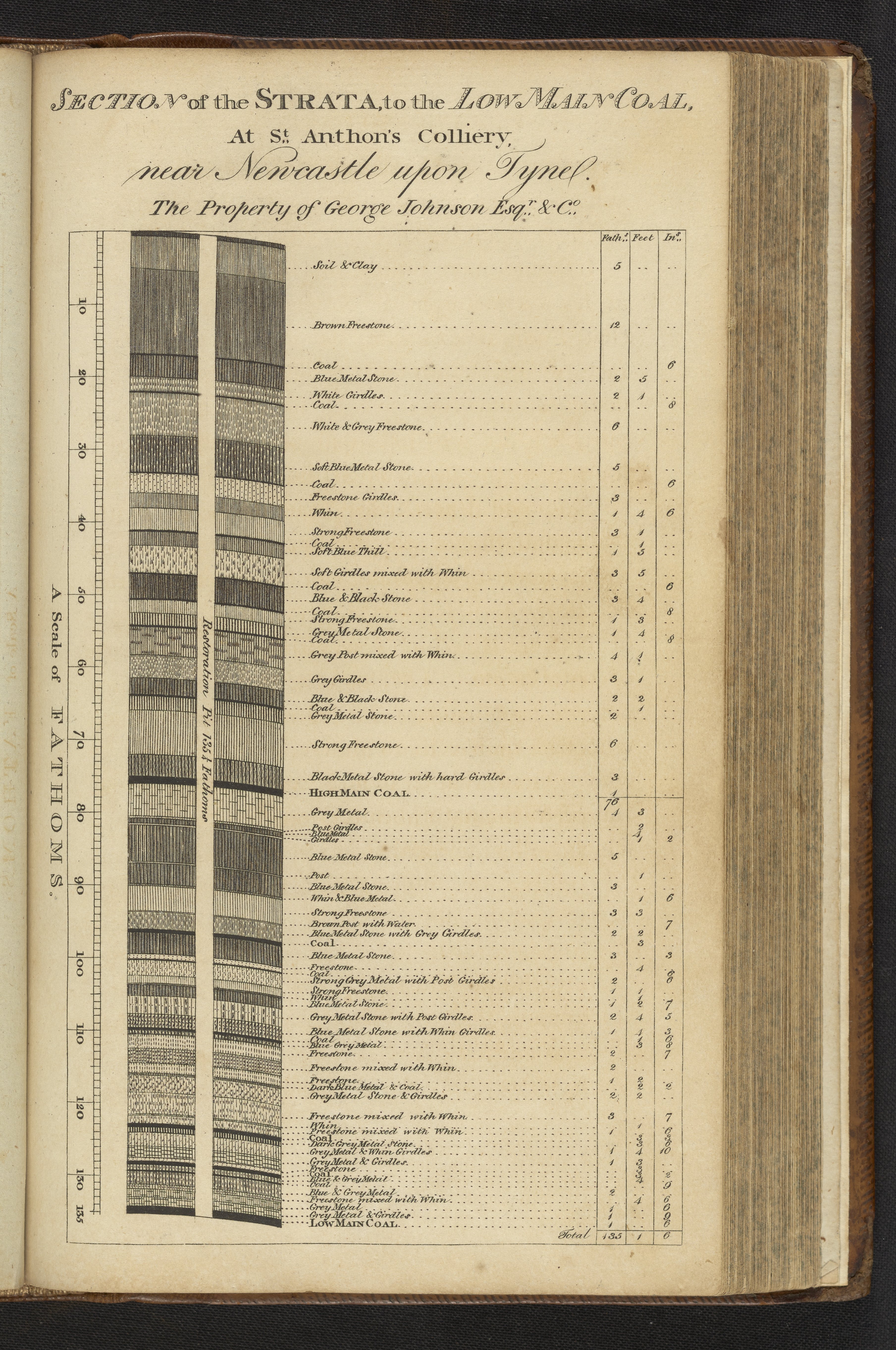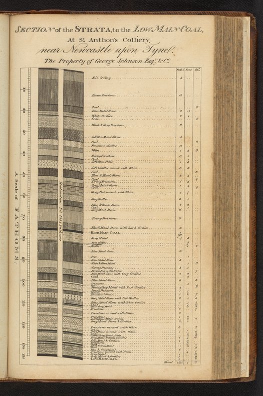 This plate depicts a section of the strata to the low main coal at St. Anthon's Colliery near Newcastle upon Tyne. The left-hand side of the graph shows a ruler denoting the different layers on a scale of fathoms. A fathom equates to around 6 feet or 2 yards. The right-hand side of the graph shows more specific measurements of some of the layers in terms of fathoms, feet, and inches.