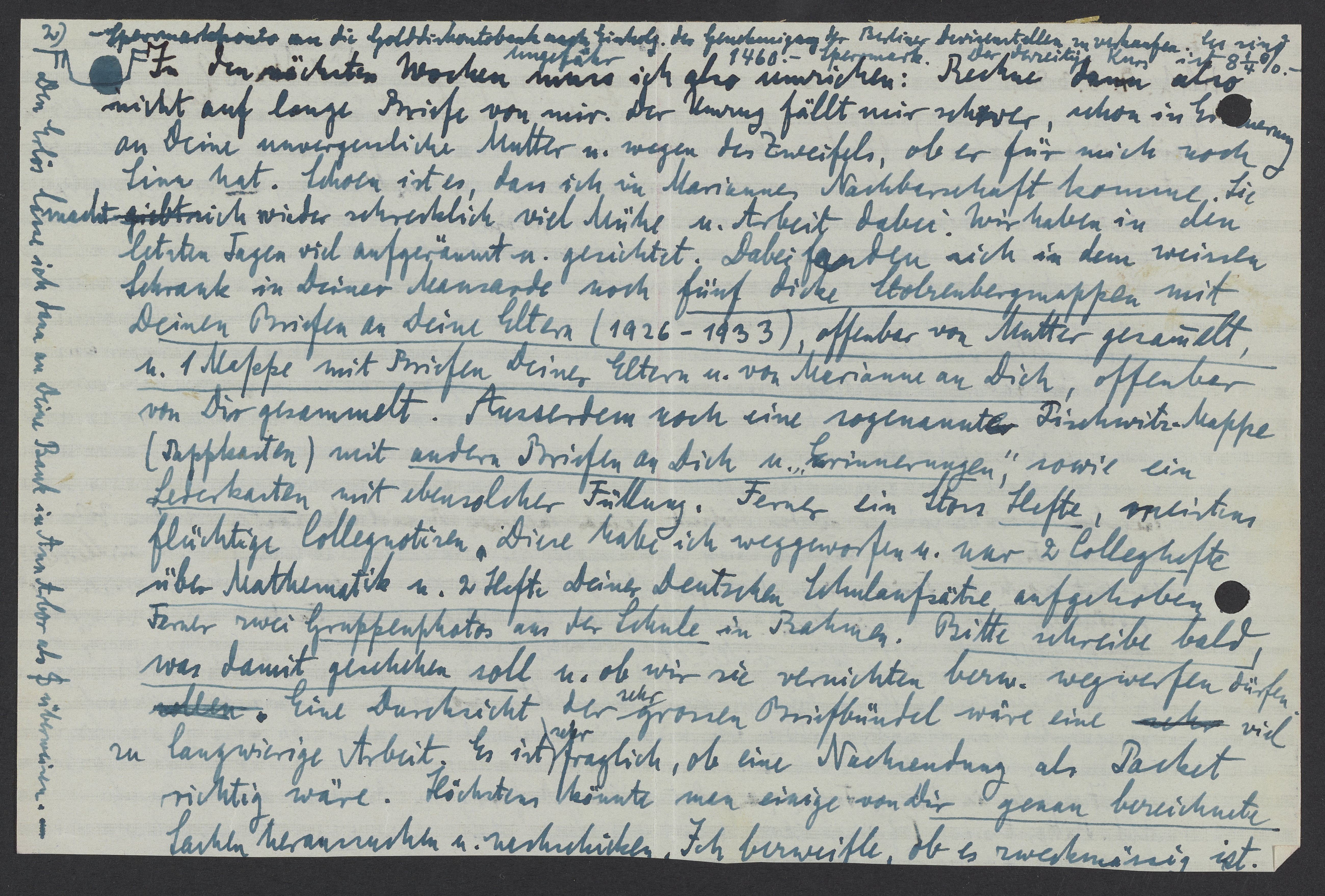 In den nächsten Wochen muss ich also umziehen: Rechne dann also an Deine unvergessliche Mutter u. wegen des Zweifels, ob es fuer mich noch Sinn hat. Schoen ist es, dass ich in Mariannes Nachbarschaft komme. Sie mach mich wieder schrecklich viel Mühe u. Arbeit dabei. Wir haben in den letzten Tagen viel aufgeräumt u. gesichtet. Dabei fand ich in dem weissen Schrank in Deiner Mansarde noch fünf dicke Stolzenbergmappen mit Deinen Briefen an Deine Eltern (1926-1933), offenbar von Mutter gesammelt, u. 1 Mappe mit Briefen Deiner Eltern u. von Marianne an Dich, offenbar von Dir gesammelt. Ausserdem noch eine sogenannte Pischwitz-Mappe (Pappkasten) mit andern Briefen an Dich u. „Erinnerungen,“ sowie ein Lederkasten mit ebensolcher Füllung. Ferner ein Stoss Hefte, meistens flüchtige Collegnotien. Diese habe ich wegegeworfen u. war 2. Collegehefte über Mathematik u. 2 Hefte Deiner Deutschen Schulaufsätze aufgehoben. Ferner zwei Gruppenphotos aus der Schule in Rahmen. Bitte schreibe bald was damit geschehen soll u. ob wir sie vernichten bezw. wegwerfen dürfen. Eine Durchsicht der sehr grossen Briefbündel wäre eine viel zu langwierige Arbeit. Höchstens könnte man einige von Dir genau bezeichnete Sachen heraussuchen u. nachschicken. Ich bezweifele, ob es zweckmässig ist.