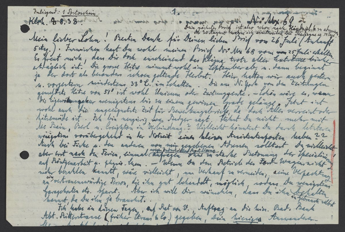 Mein lieber Sohn! Besten Dank fuer Deinen lieben Brief von 26 Juli (Ankunft 5 Aug.) Inzwischen hast Du wohl meinen Brief No. Mx 68 vom 25 Juli erhalten. Es freut mich, dass Dir doch anscheinend das Klima trotz aller Extreme bisher erträglich ist. Die grosse Hitze nimmt wohl im September ab., u. dann beginnt ja der dort als besonders schon geltende Herbst. Hier hatten wir auch gestern u. vorgestern mindestens 33 ° C im Schatten. Die aus N.York von den Zeitungen gemeldete Hitze von 51° ist wohl Unsinn oder Zeitungsente. – Schoen wäre es, wenn die Eigewöhnungskur wenigstens bis zu einem gewissen Grade gelänge. Jetzt ist wohl auch die ungeeignetste Zeit fuer Bewerbungsbriefe, da doch Alles verreist oder hitzemüde ist. Ich bin neugierig was Badger sagt. Stehst Du nicht mehr mit Creighton in Verbindung? Vielleicht könntest durch letzteren wenigstens vorübergehend in der Notzeit einen Assistentenposten haben?? Auch bei Fiske u. den anderen von mir gegebenen Adressen solltest Du vielleicht aber erst nach den Ferien, einmal anfangen wegen Industrieller Anstellung anfragen ohne zu starke Betonung der Spezialisierung auf Röntgenarbeit u. physic. Chem. – Wenn Du den Betriebe des Ford-Wagens nicht mehr bezahlen kannst, wäre vielleicht, um Verkauf zu vermeiden, seine Verpachtung an eine vertrauenswürdige Person, die ihn gut behandelt, möglich, sodass Du wenigstens Garagekosten etc sparst. Aber ich will Dir wünschen, dass Du ich in Gebrauch selbst behalten kannst, da Du ihn ja brauchst.