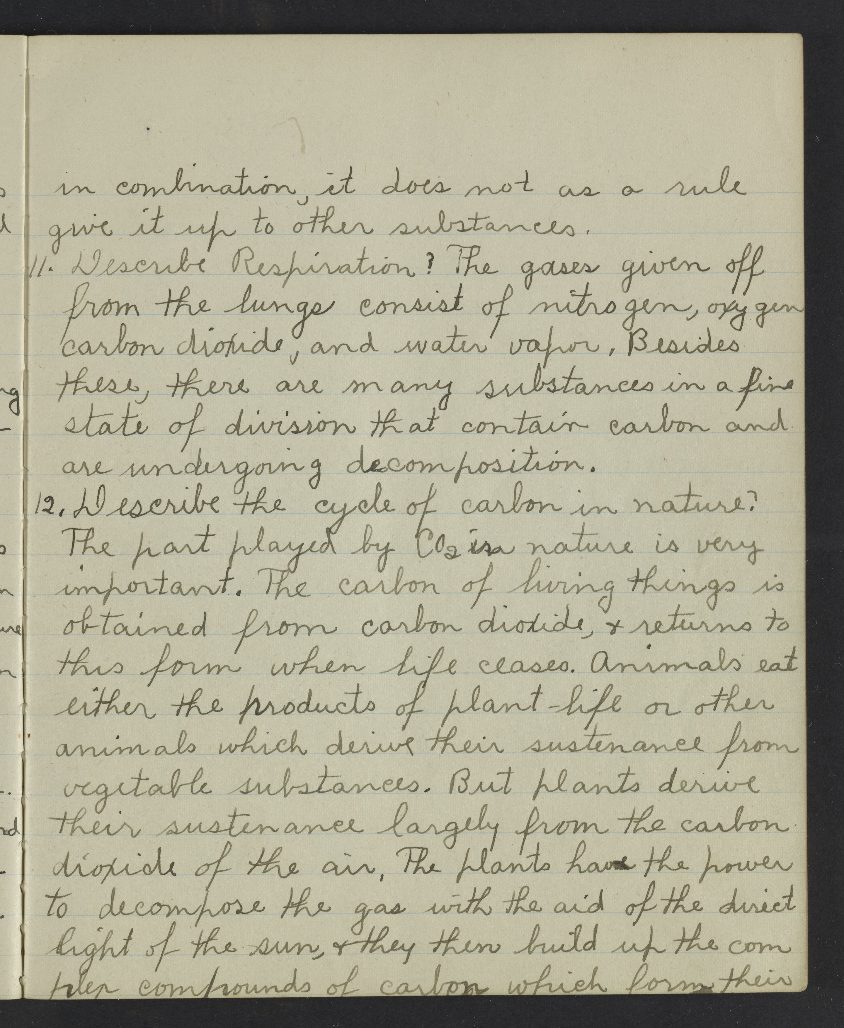 Small JPG1200 x 1414px — 362 KBLarge JPG2880 x 3394px — 2.1 MBFull-sized JPG4873 x 5743px — 5.3 MBOriginal fileTIFF — 4873 x 5743px — 80.1 MBNotebook used by Rose Agnes Brabenec (1889-1963) during a high school-level chemistry class in Chesterland, Ohio. The notebook begins with notes pertaining to carbon (chapter 11, page 176) and includes a variety of lecture notes, lists of chemical names and symbols, answers to textbook questions, and descriptions of various experiments. Topics covered include the occurrence of carbon in plants and animals, the properties and preparation of carbon dioxide, laws governing the combination of gases, and the extraction of sulphur. Notably, the names of Brabenec and her peers, the "class of 1907," are inscribed inside the back cover of the notebook.
