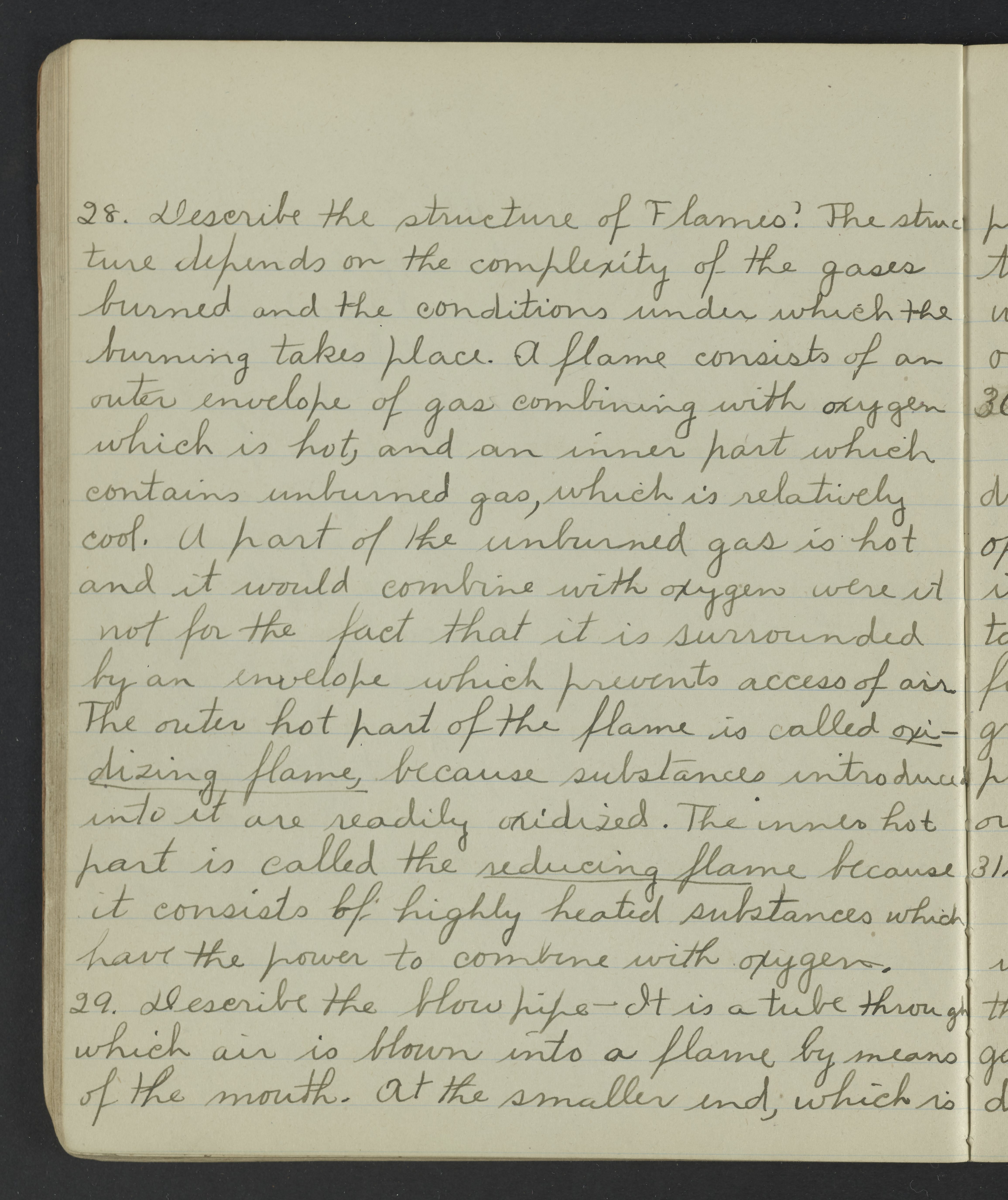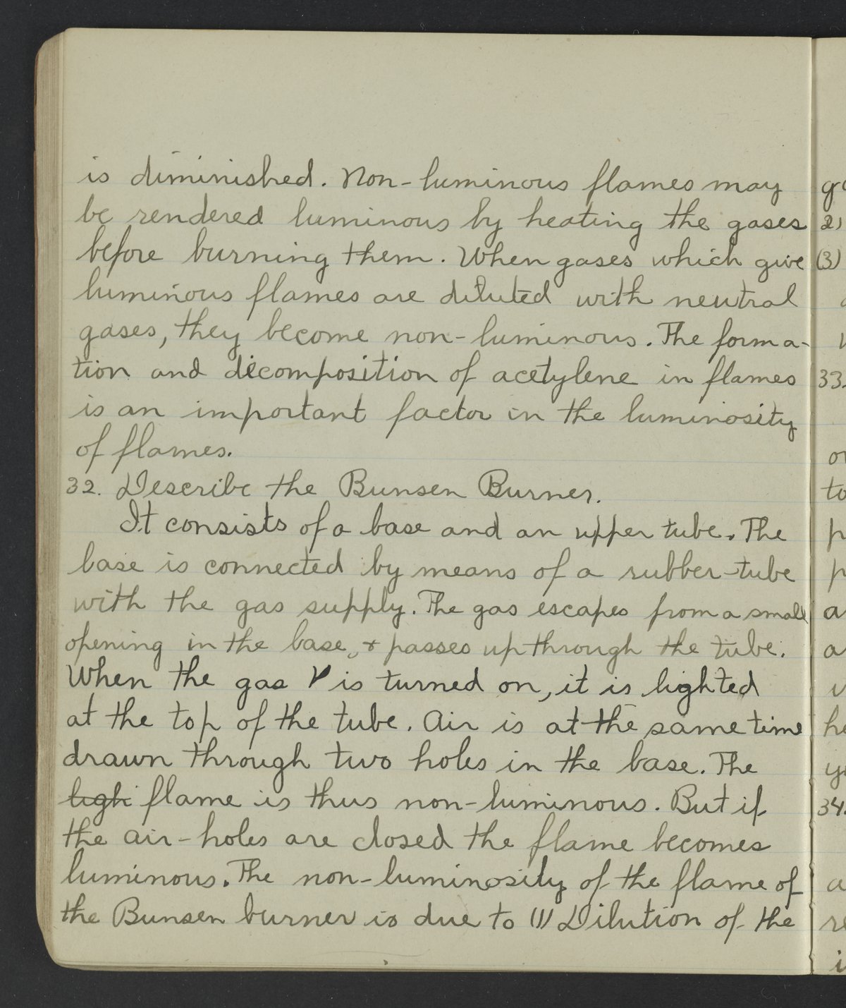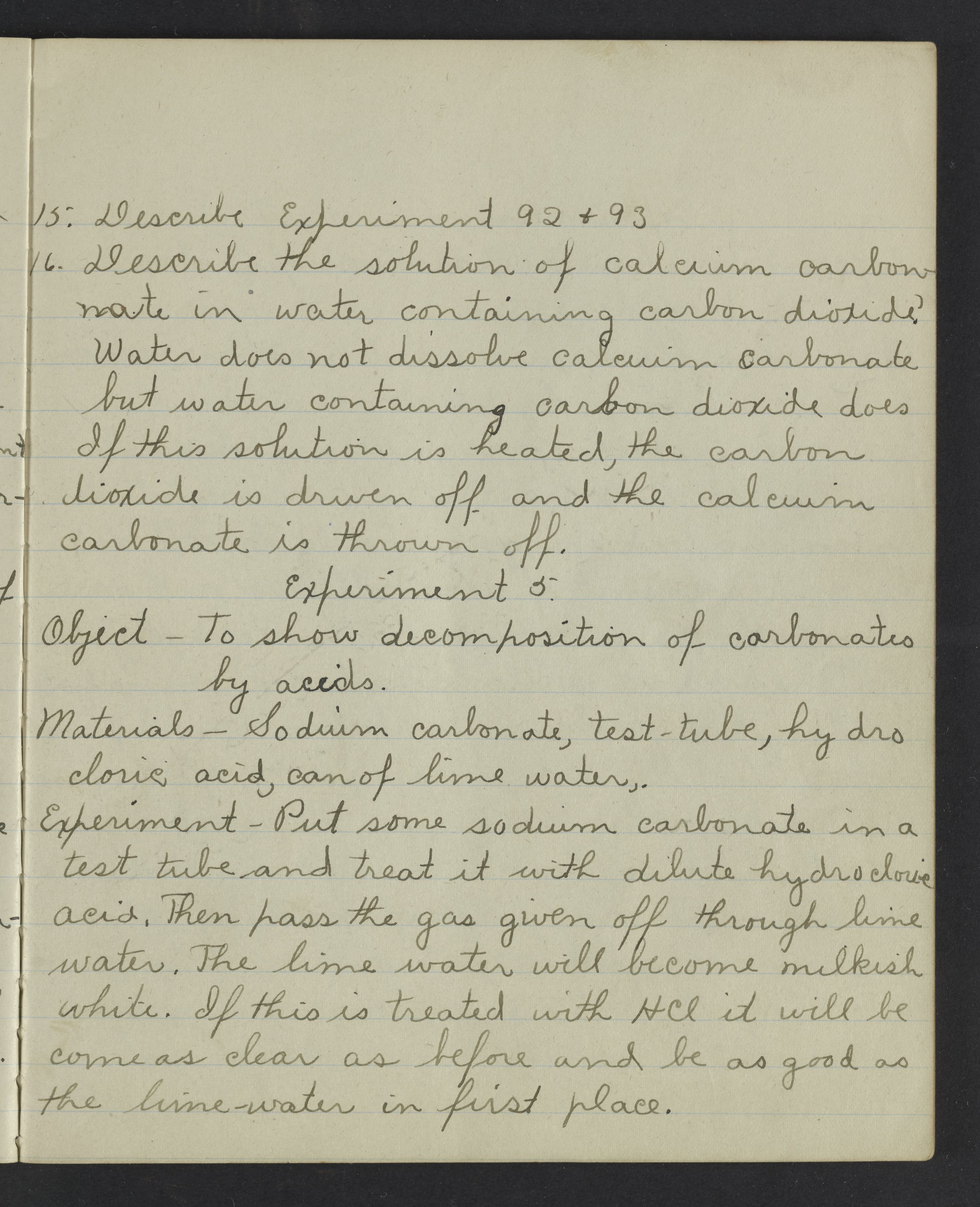 Small JPG1200 x 1414px — 362 KBLarge JPG2880 x 3394px — 2.1 MBFull-sized JPG4873 x 5743px — 5.3 MBOriginal fileTIFF — 4873 x 5743px — 80.1 MBNotebook used by Rose Agnes Brabenec (1889-1963) during a high school-level chemistry class in Chesterland, Ohio. The notebook begins with notes pertaining to carbon (chapter 11, page 176) and includes a variety of lecture notes, lists of chemical names and symbols, answers to textbook questions, and descriptions of various experiments. Topics covered include the occurrence of carbon in plants and animals, the properties and preparation of carbon dioxide, laws governing the combination of gases, and the extraction of sulphur. Notably, the names of Brabenec and her peers, the "class of 1907," are inscribed inside the back cover of the notebook.