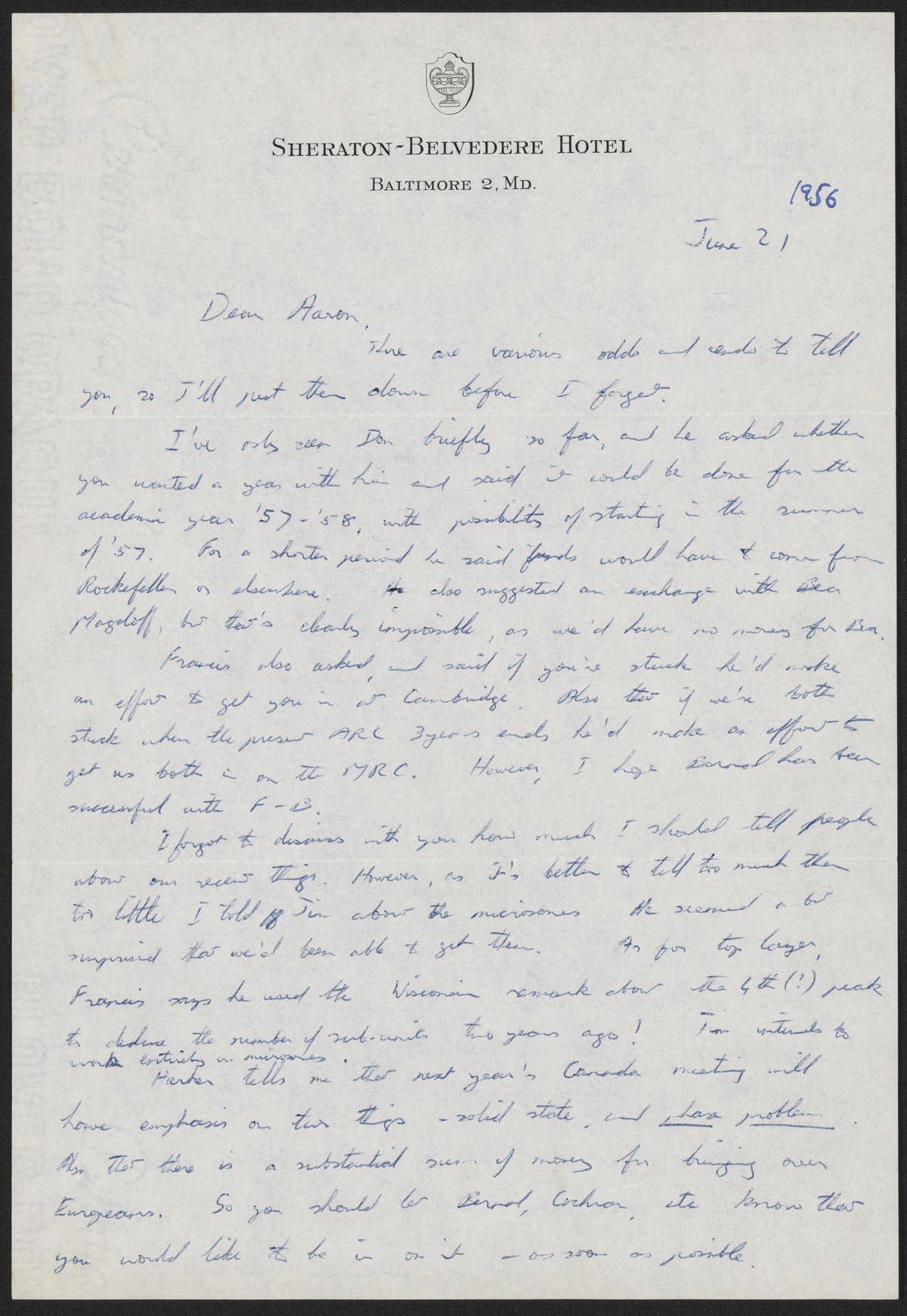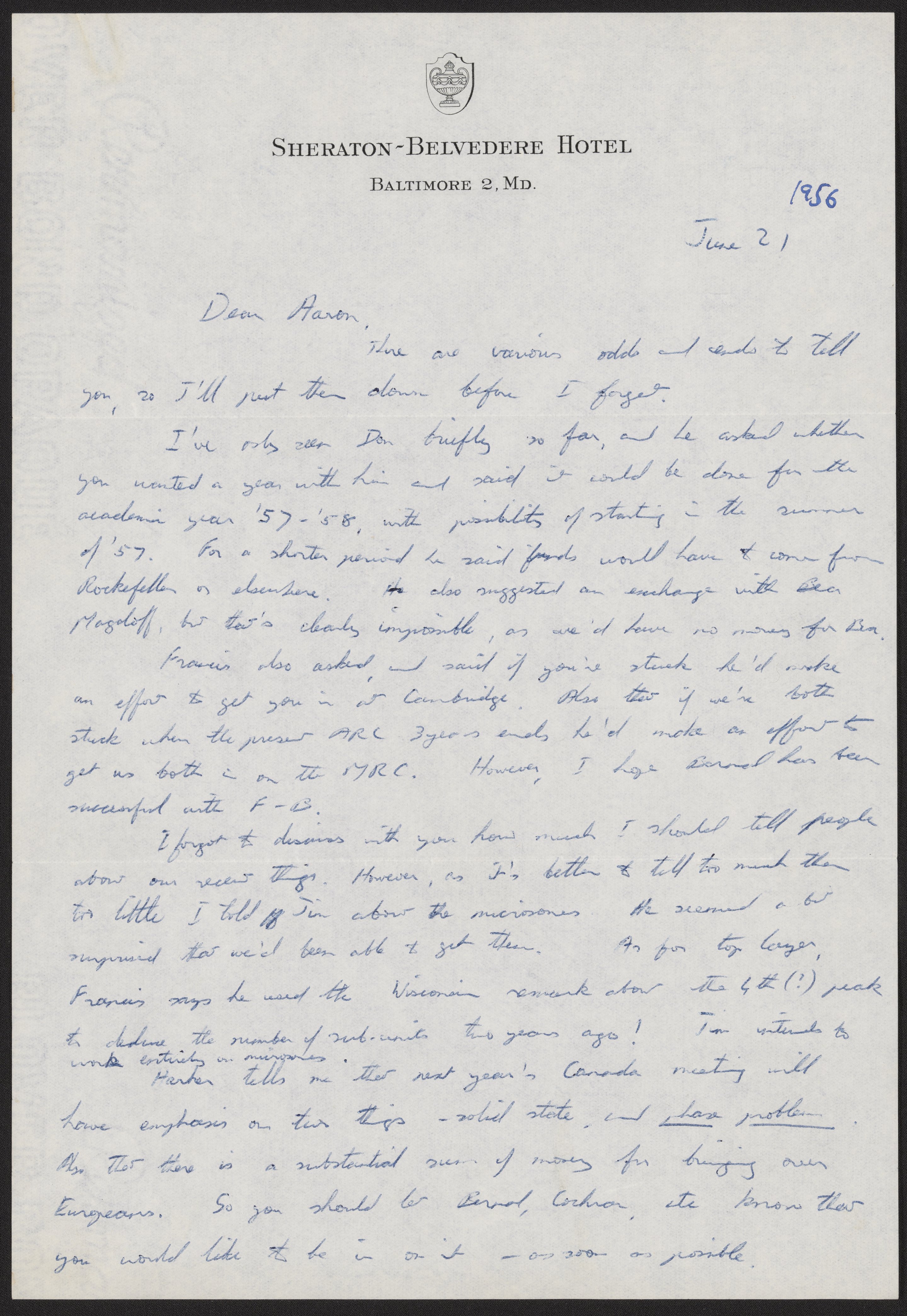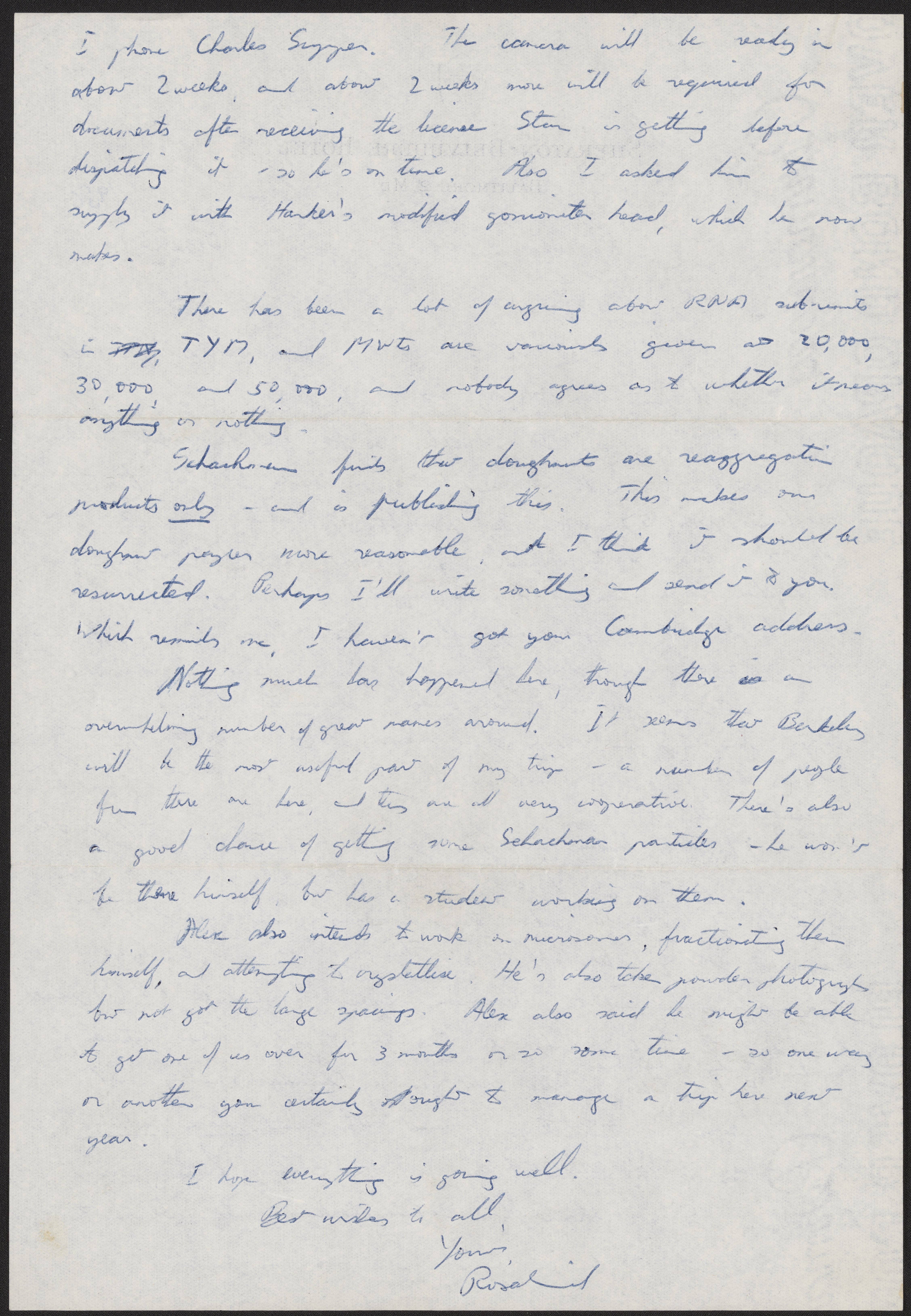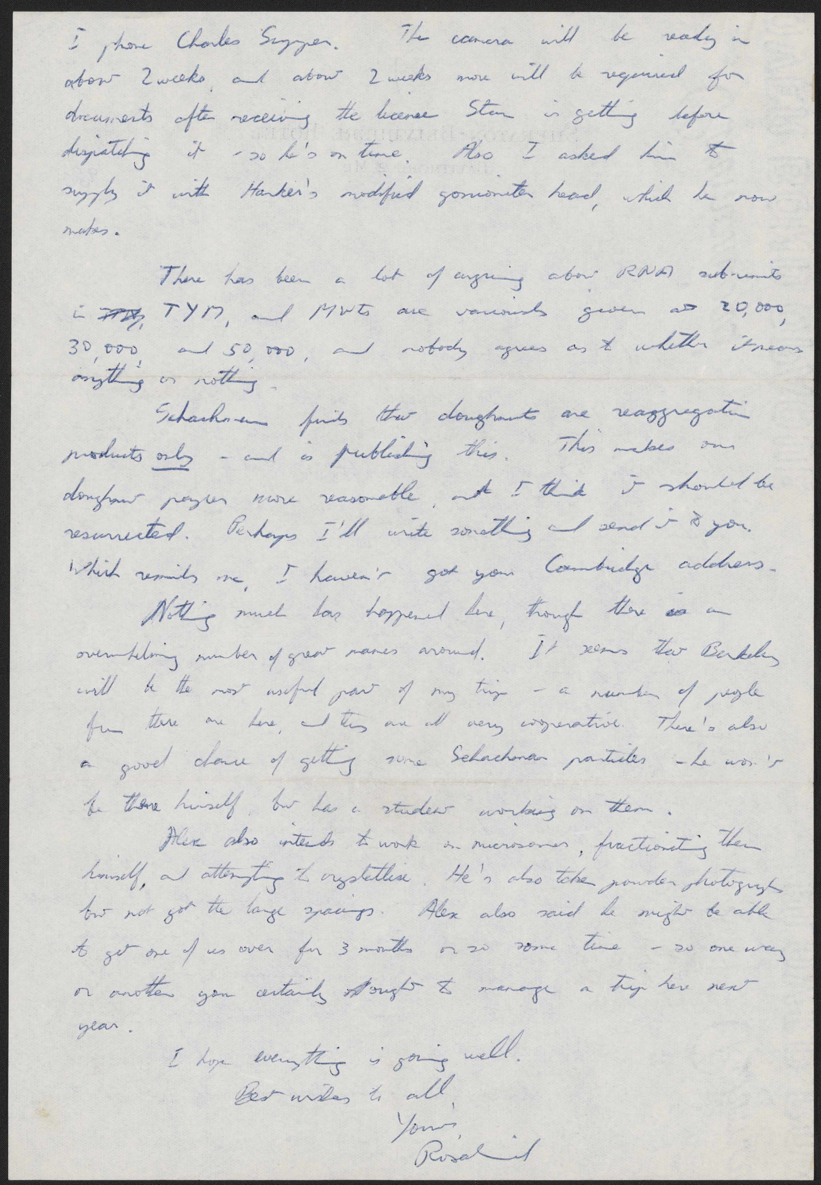 Letter from Rosalind Franklin to Aaron Klug, June 21, 1956