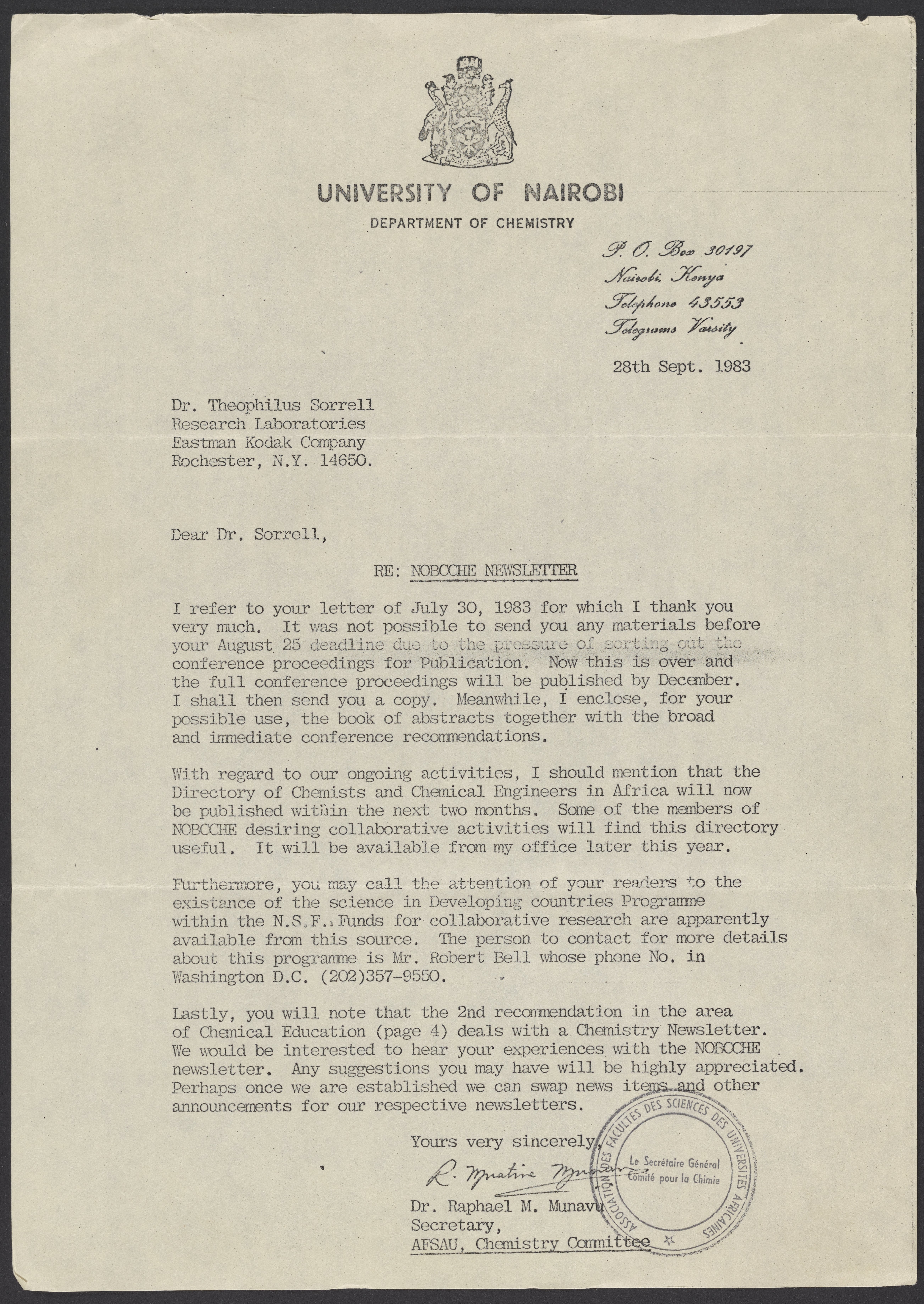Letter from Raphael M. Munavu, the secretary for the Association of Faculties of Science of African Universities (AFSAU) Chemistry Committee, and a member of the department of chemistry at the University of Nairobi, to Theophilus Sorrell at the Eastman Kodak Company's Research Laboratories. Munavu writes about the Science in Developing Countries (SDC) program, which was a program sponsored by the National Science Foundation (NSF), and other initiatives about science in Africa.