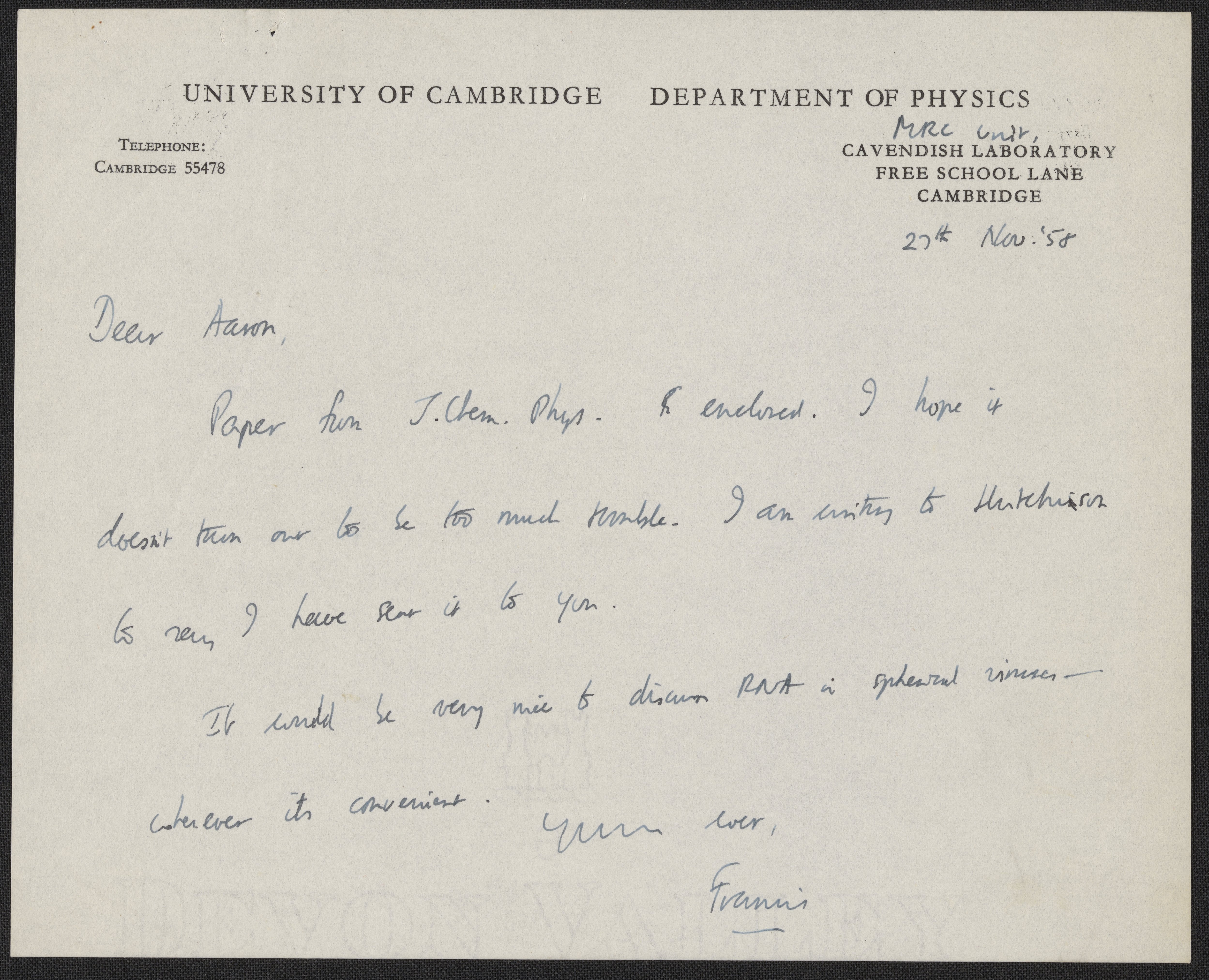 Letter from Francis Crick to Aaron Klug, November 27, 1958