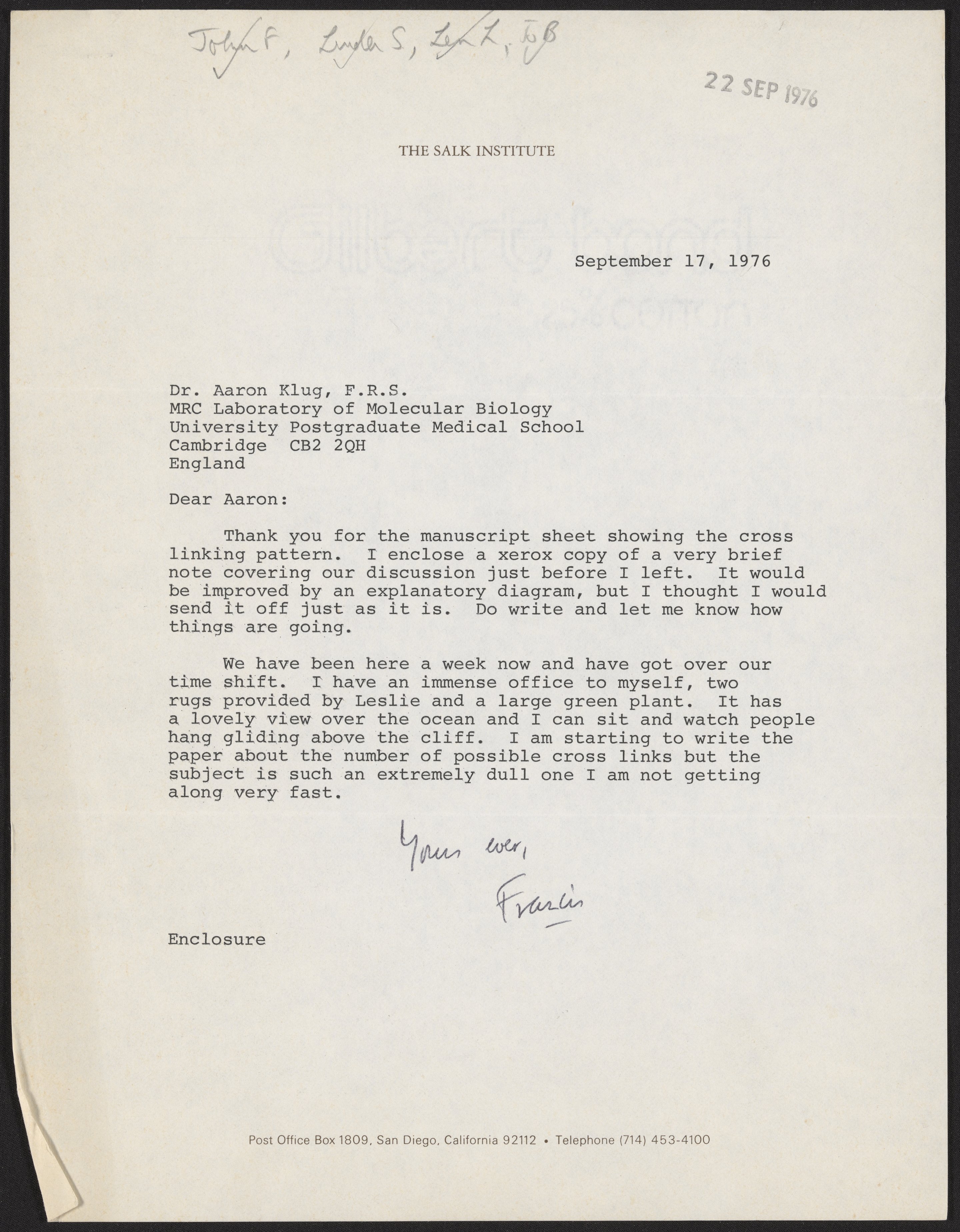 Crick, Francis. “Letter from Francis Crick to Aaron Klug, September 17, 1976,” September 17, 1976. History of Molecular Biology Collection, Box 19, Folder 25. Science History Institute. Philadelphia. https://digital.sciencehistory.org/works/l9szq0e.