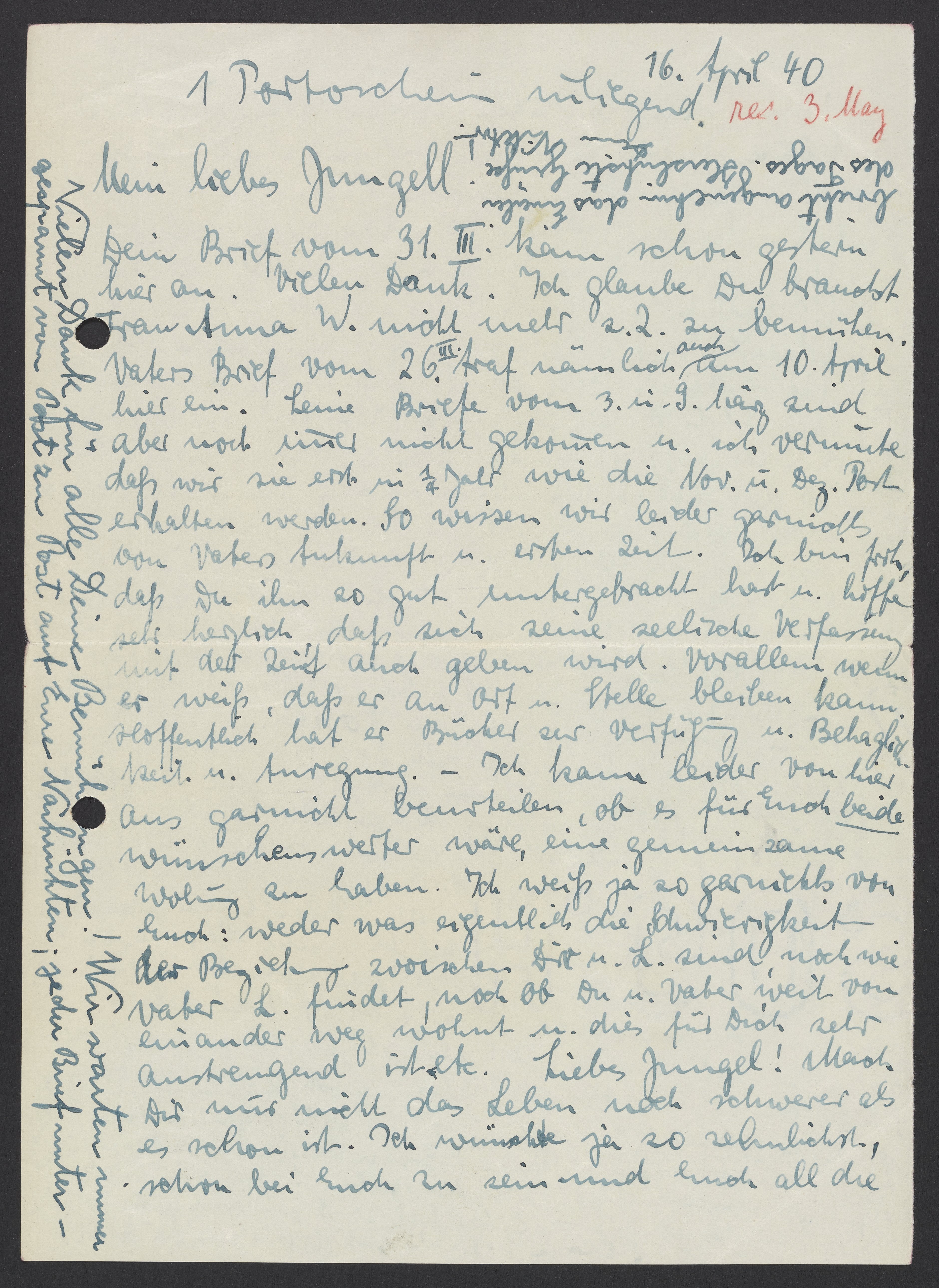 Your letter from March 31st arrived here yesterday. Many thanks. I don’t think you need to bother with Mrs. Ann W. for the time being. Father’s letter from March 26th actually arrived here on April 10th. His letters from March 3rd and 9th never arrived. I assume that we will not receive them for another quarter year like the November and December mail. Unfortunately, we don’t know anything about Father’s arrival and first days there. I am glad that you have accommodated him so well and sincerely hope that his emotional state will improve over time, especially when he knows that he can stay in one place. Hopefully, he has books to read, the comforts of home, and intellectual stimulation. Unfortunately, I can’t judge from here whether it would be preferable for you both to share an apartment. I don't know anything about you all, especially about the difficult nature your relationship with Liselotte, what Father thinks about Liselotte, or if it would be very stressful for you if you and Father live far apart. I really wish I could be with you both to