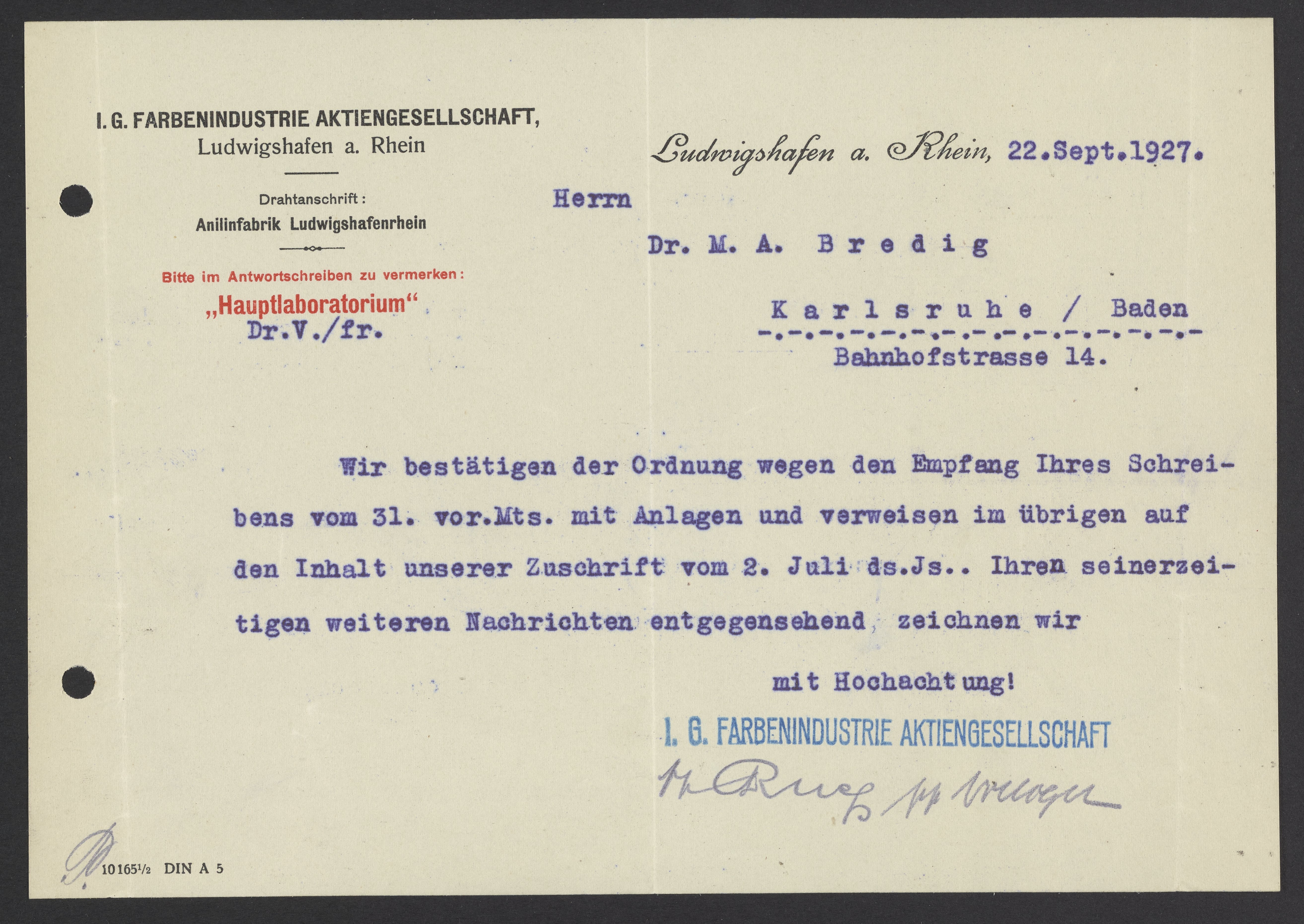 Letter from I.G. Farben to Max Bredig, September 22, 1927