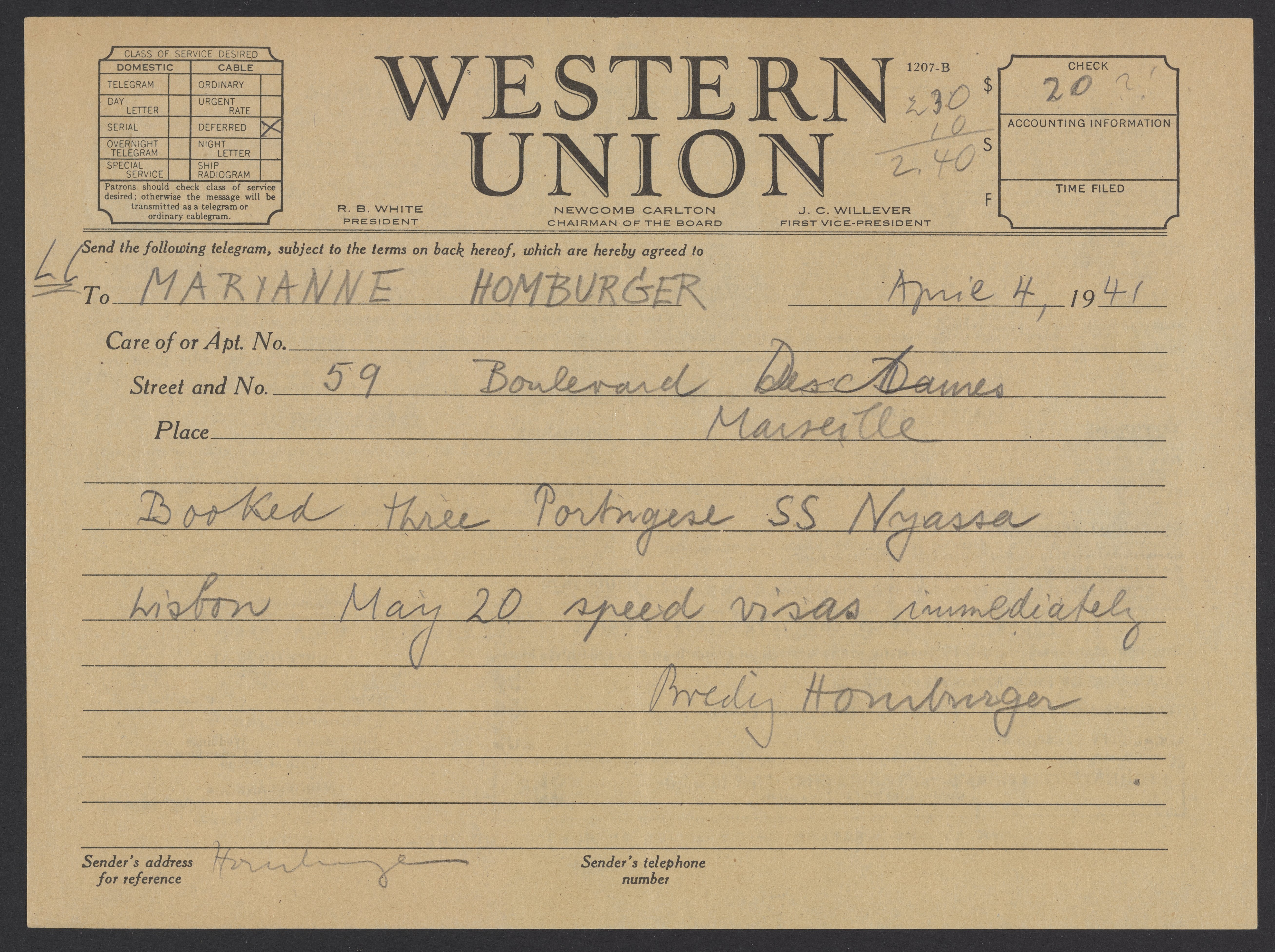 Telegram from Max Bredig to Marianne Homburger, April 4, 1941