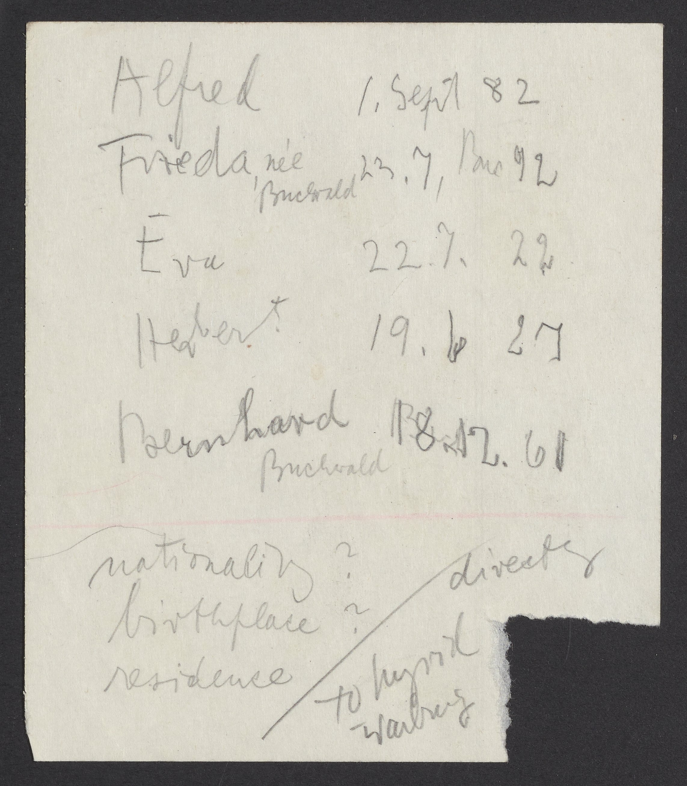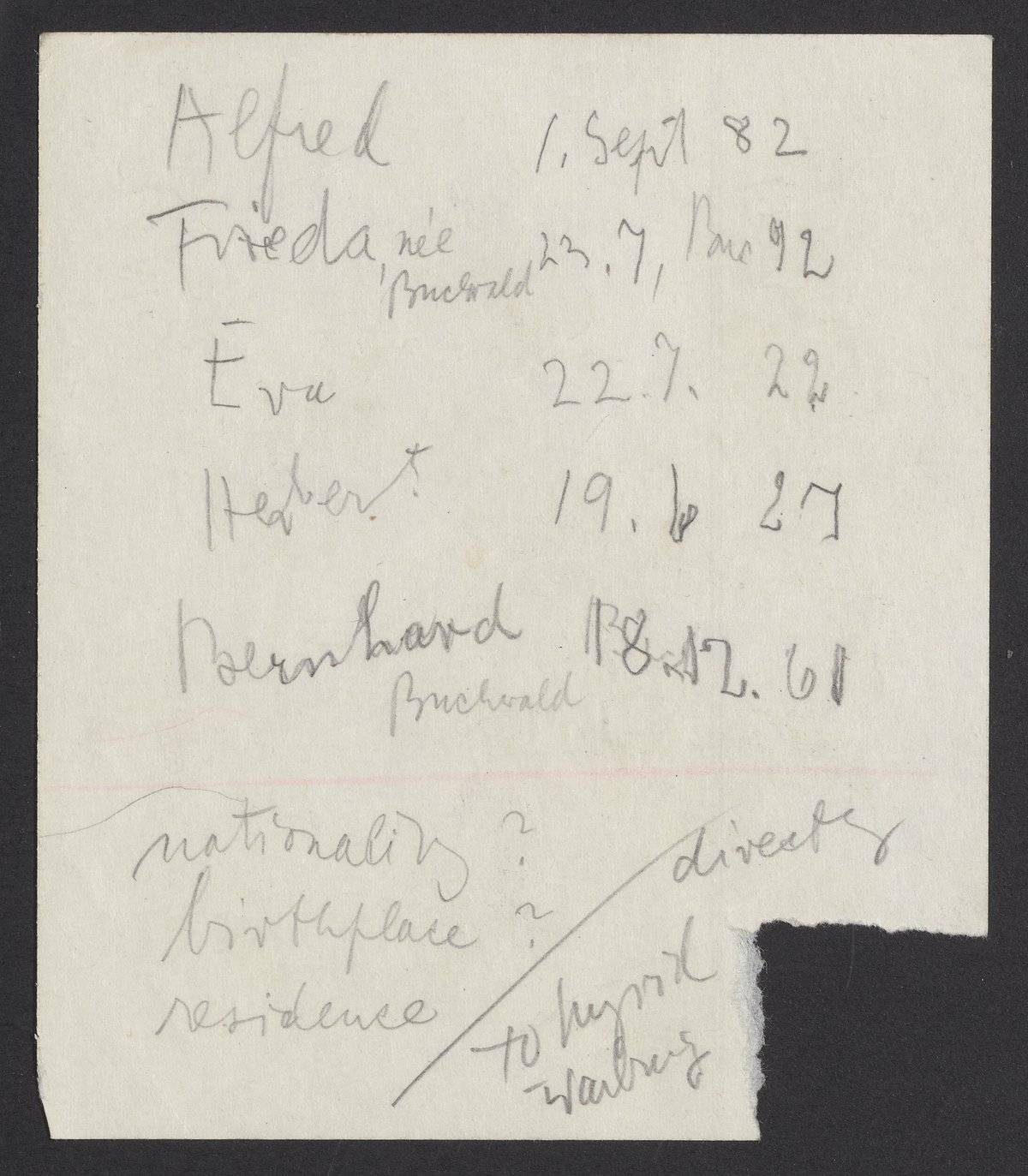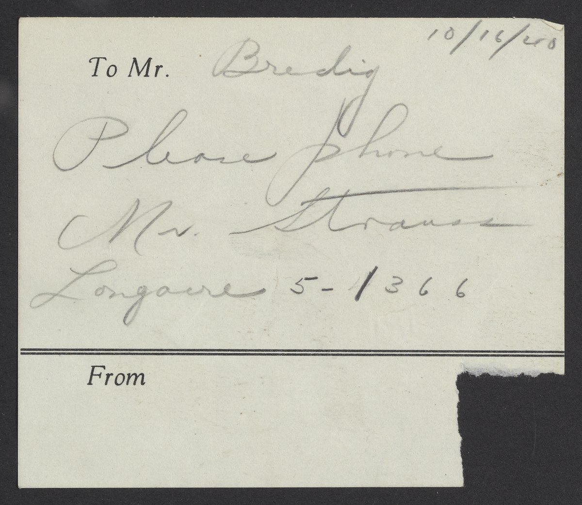 Small JPG1200 x 1042px — 163 KBFull-sized JPG2620 x 2275px — 812 KBOriginal fileTIFF — 2620 x 2275px — 17.1 MBA note from an unidentified author, instructing Max Bredig (1902-1977) to "please phone Mr. Strauss." The backside of the page lists names including Alfred and Eva Schell and Frieda and Bernhard Buchwald alongside dates of unknown significance.