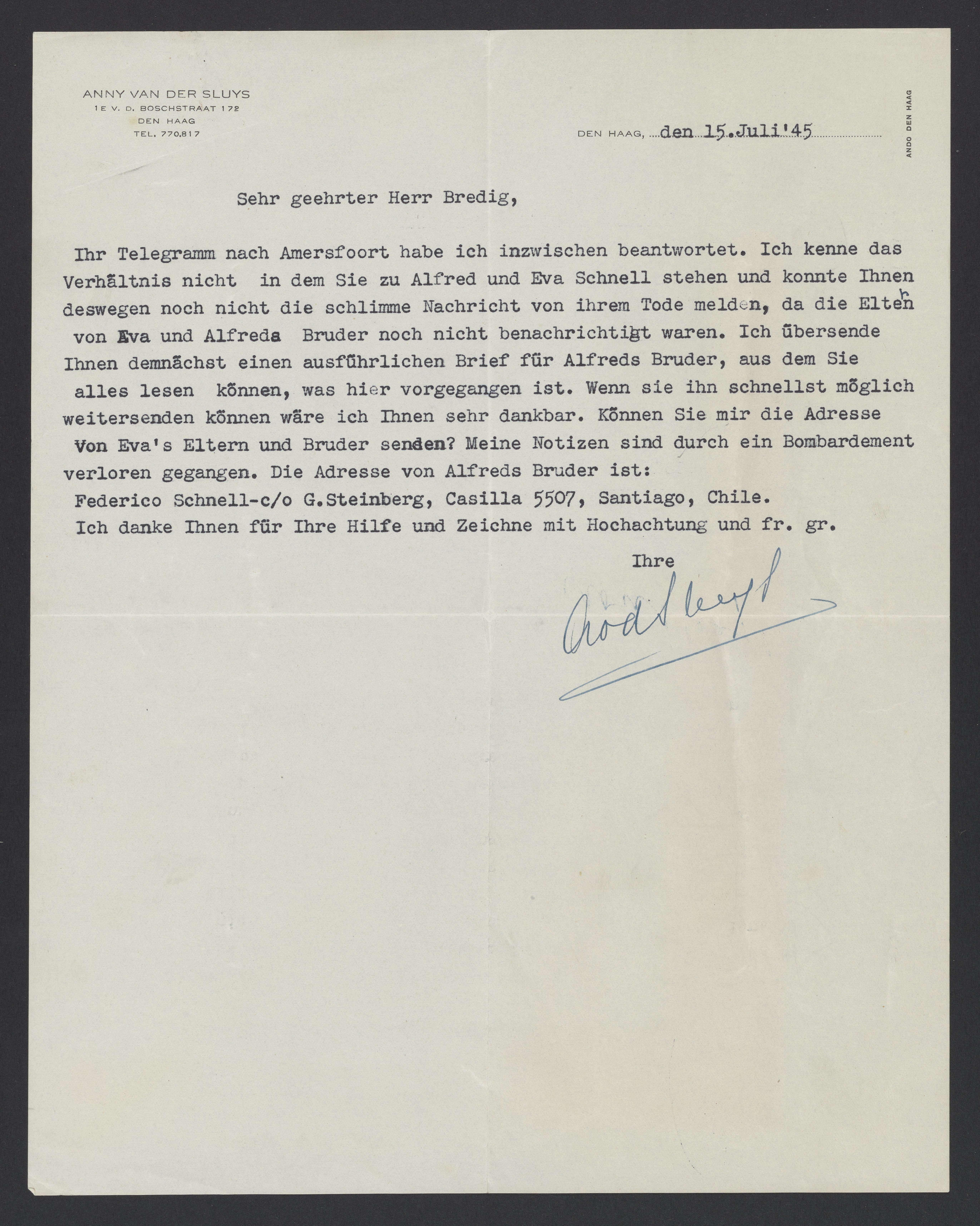 In the meantime, I have answered your telegram that was sent to Amersfoort. I don’t know the relationship you have with Alfred and Eva Schnell. I have thus not been able to report the terrible news of their death to you because Eva’s parents and Alfred's brother were not yet informed. Soon, I will send you a detailed letter for Alfred's brother in which you can read everything that transpired. If you can forward it as soon as possible, I would be very grateful. Can you send me the address of Eva's parents and brother? My notes were lost in a bombing. The address of Alfred Schnell's brother is: