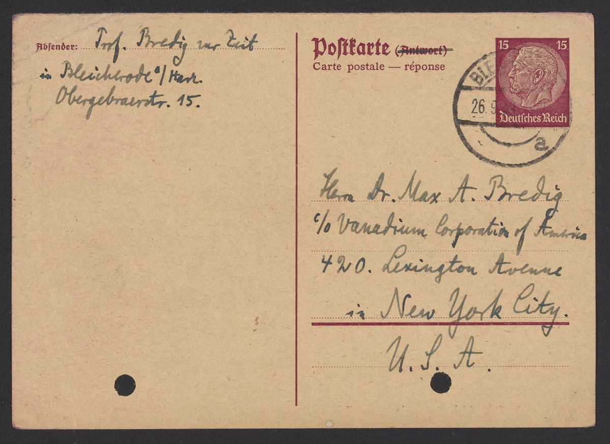 Bredig, Georg. “Postcard from Georg Bredig to Max Bredig, September 26, 1939,” September 26, 1939. Papers of Georg and Max Bredig, Box 7, Folder 15. Science History Institute. Philadelphia. https://digital.sciencehistory.org/works/liu5yr9.