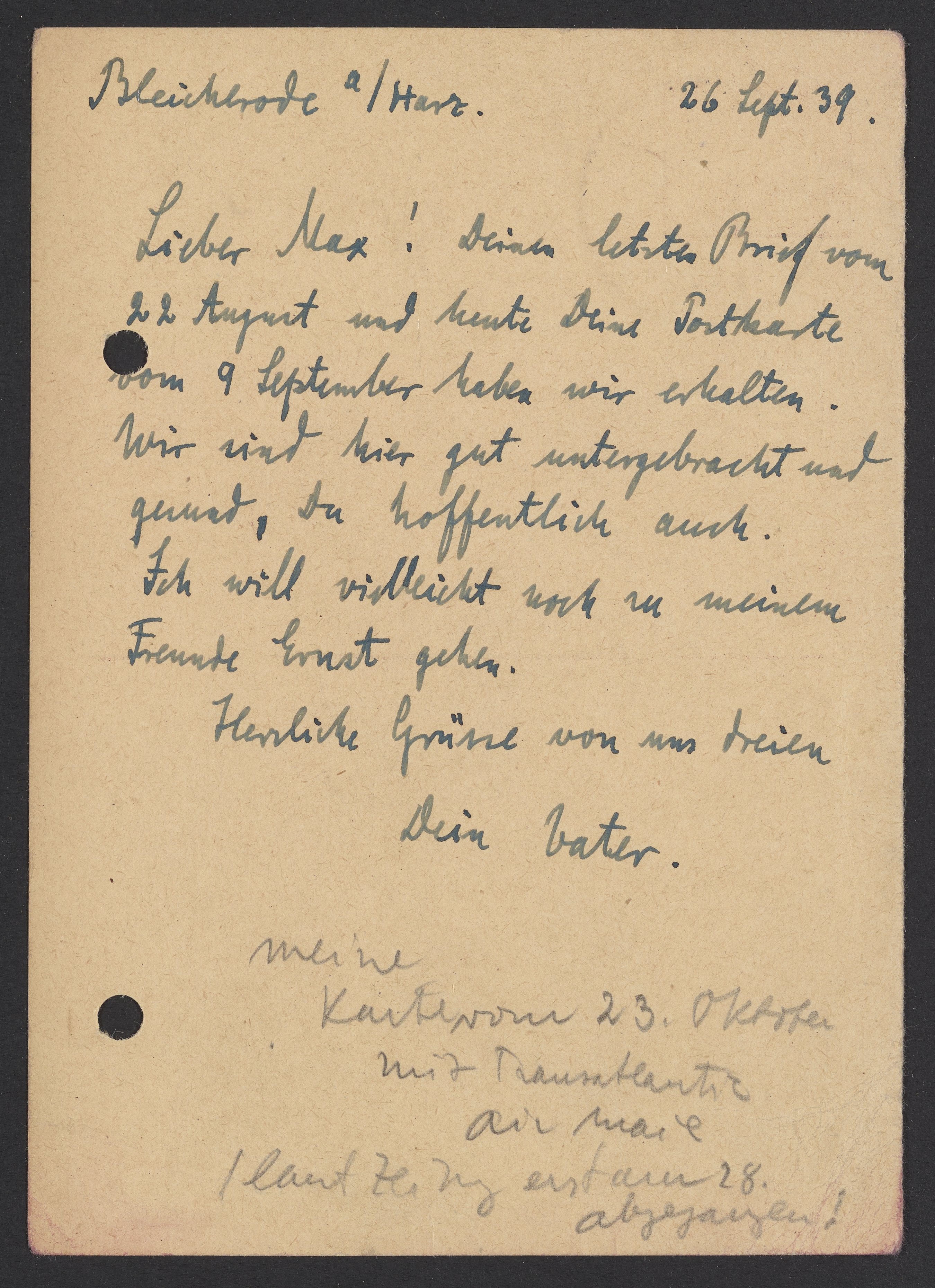 Lieber Max! Deinen letzten Brief vom 22 August und heute Deine Postkarte vom 9 September haben wir erhalten. Wir sind hier gut untergebracht und gesund. Du hoffentlich auch. Ich will vielleicht zu meinem Freund Ernst gehen.