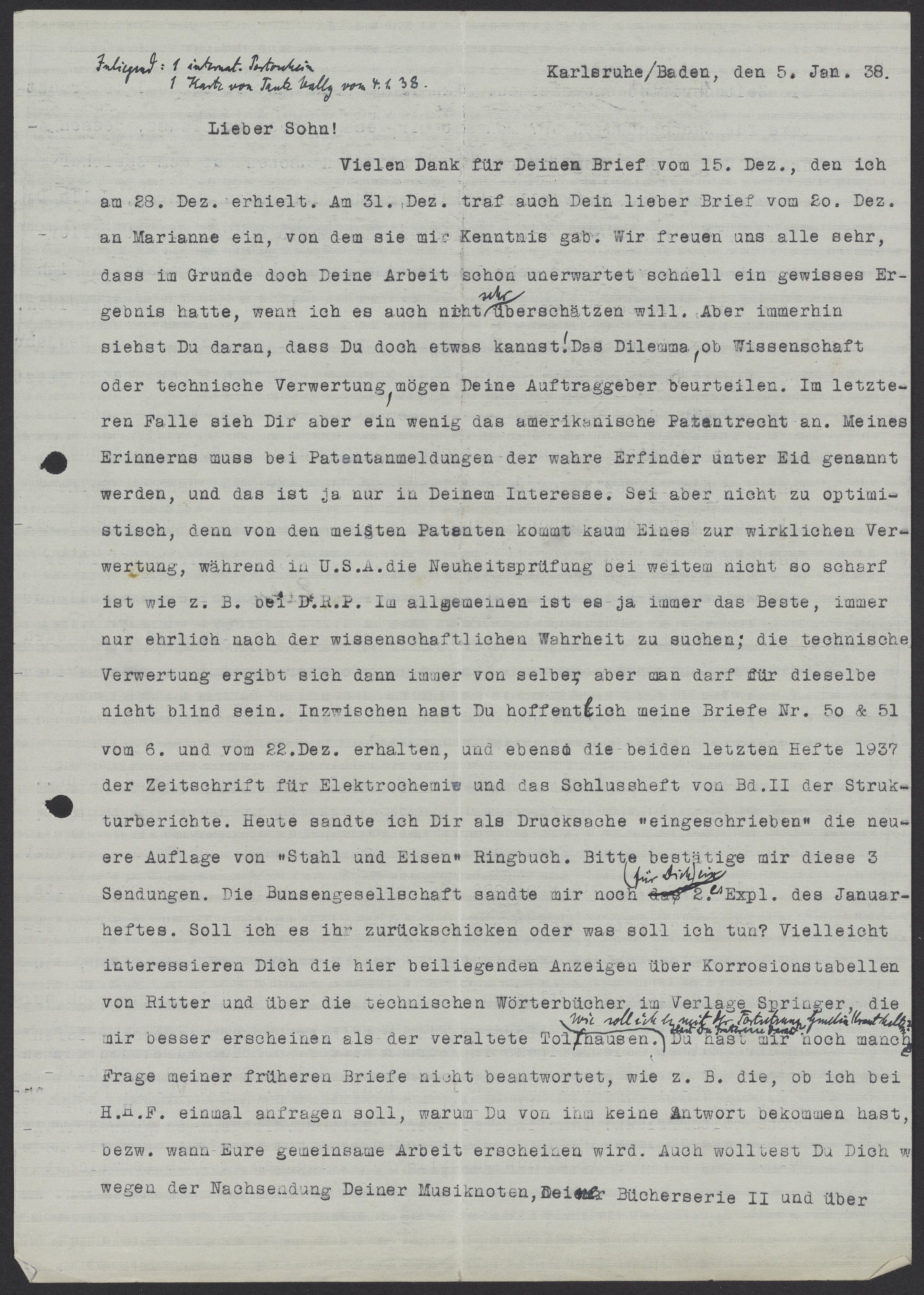 Letter from Georg Bredig to Max Bredig, January 5, 1938