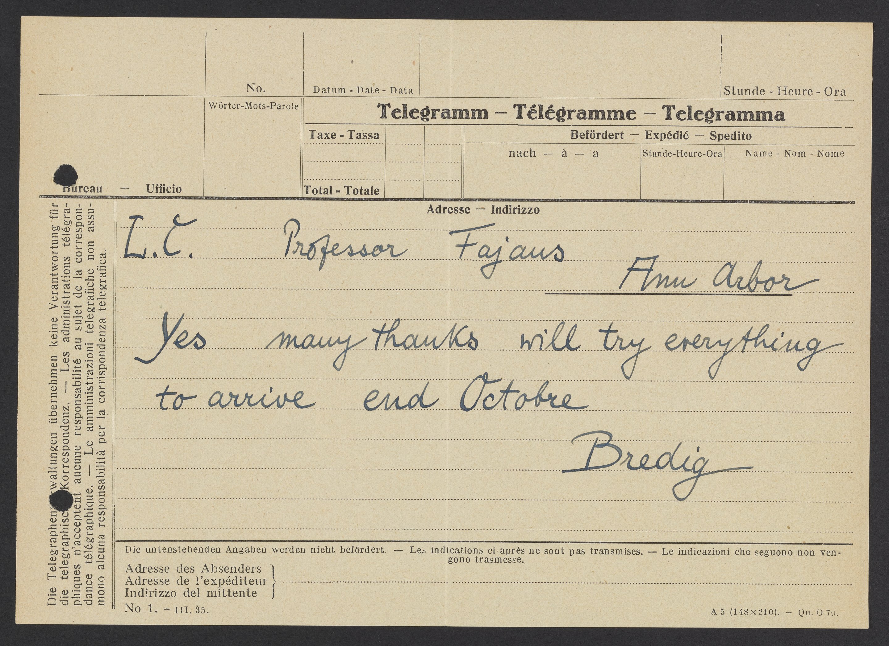 Telegram from Max Bredig to Kasimir Fajans