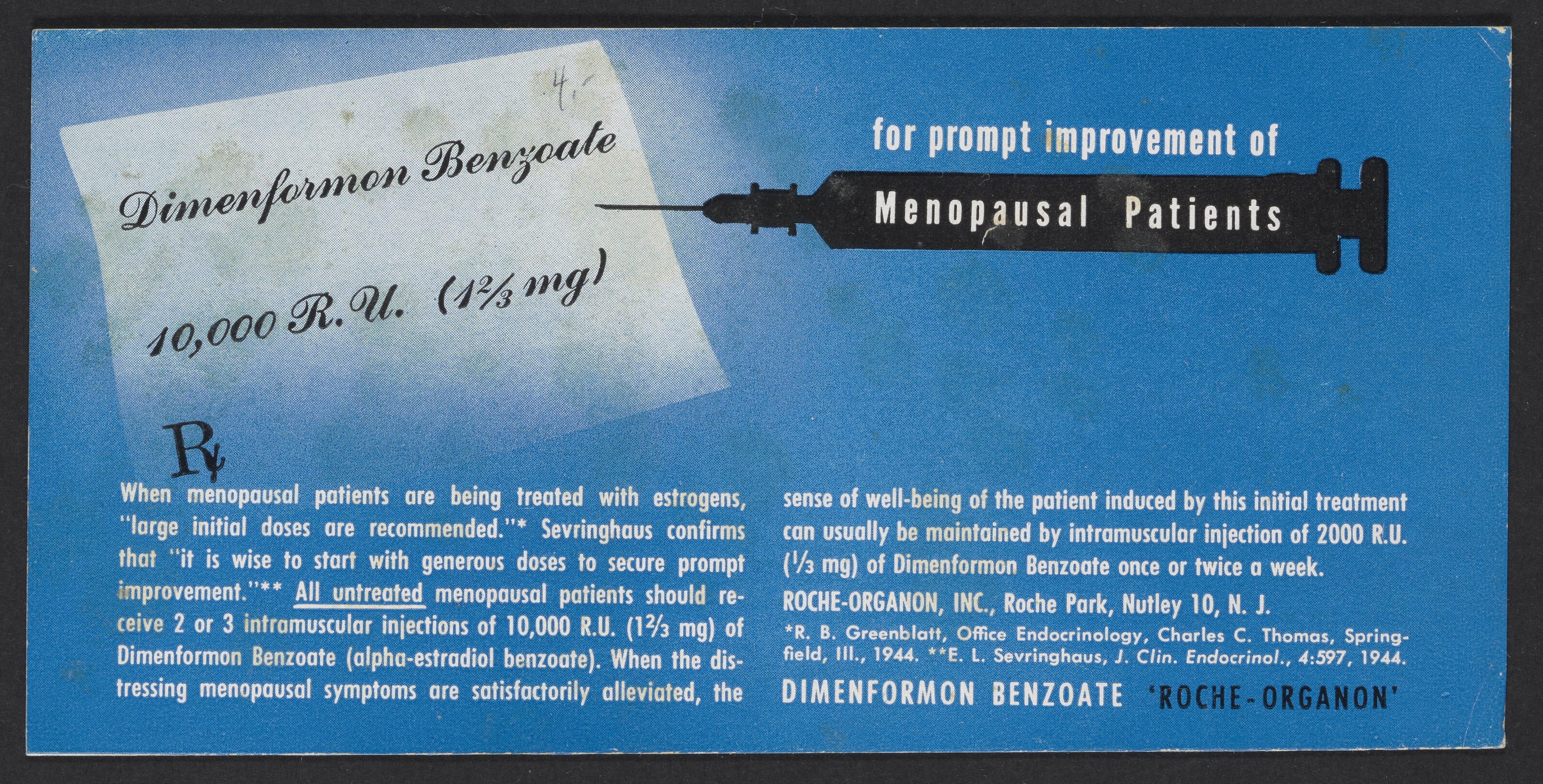 Roche-Organon, Inc. “Dimenformon Injections Promotional Blotter,” 1940–1949. Science History Institute. Philadelphia. https://digital.sciencehistory.org/works/llt0v45.
