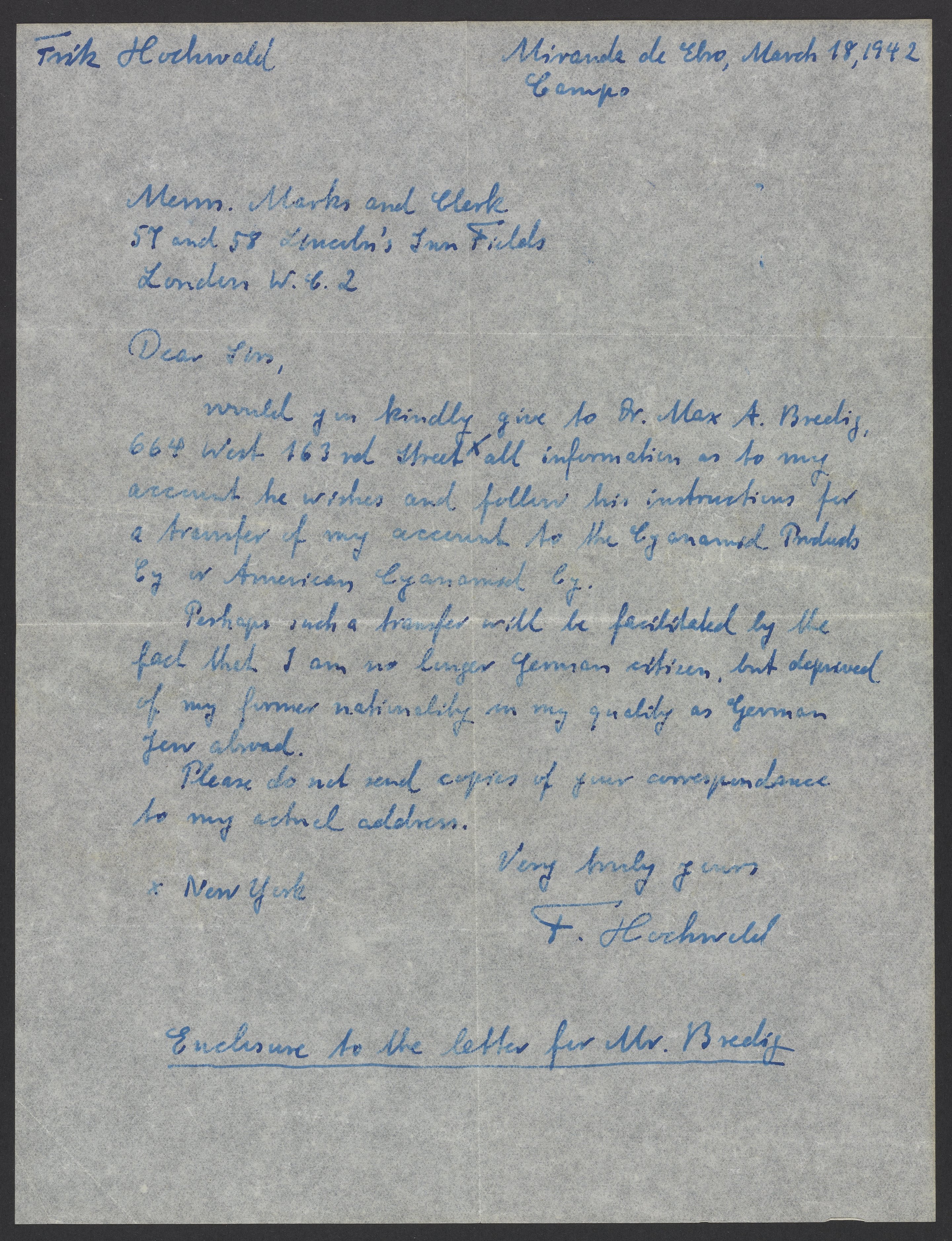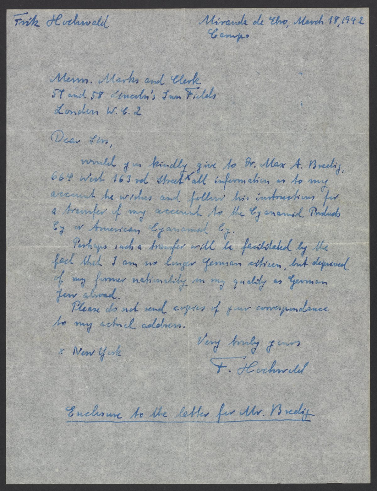 Letter from Fritz Hochwald to Messrs. Marks and Clark, March 18, 1942