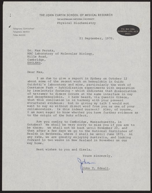 Edsall, John T. (John Tileston). “Letter from John T. Edsall to Max Perutz, September 21, 1970,” September 21, 1970. History of Molecular Biology Collection, Box 74, Folder 12. Science History Institute. Philadelphia. https://digital.sciencehistory.org/works/lpr3jqi.