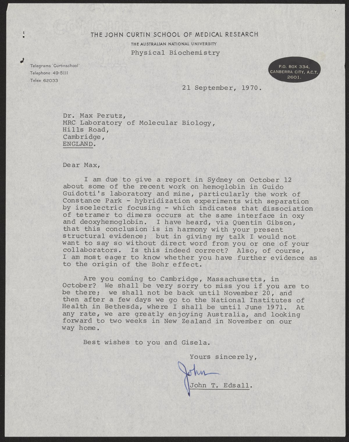 Letter from John T. Edsall to Max Perutz, September 21, 1970