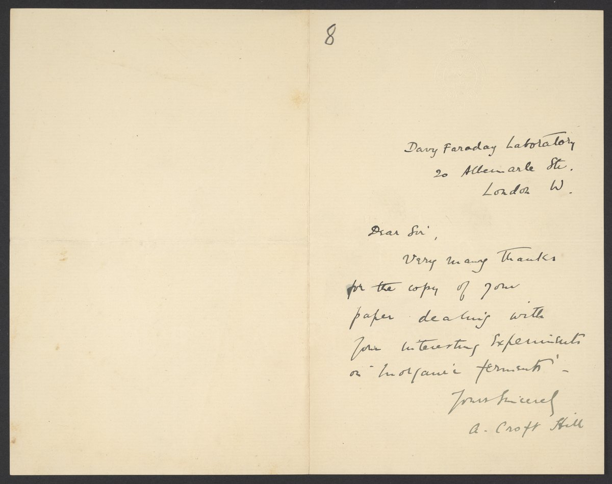 Arthur Croft Hill (1863-?), a chemist in the Davy Faraday Research Laboratory of the Royal Institution, thanks Georg Bredig (1868-1944) for a copy of his paper on inorganic ferments.