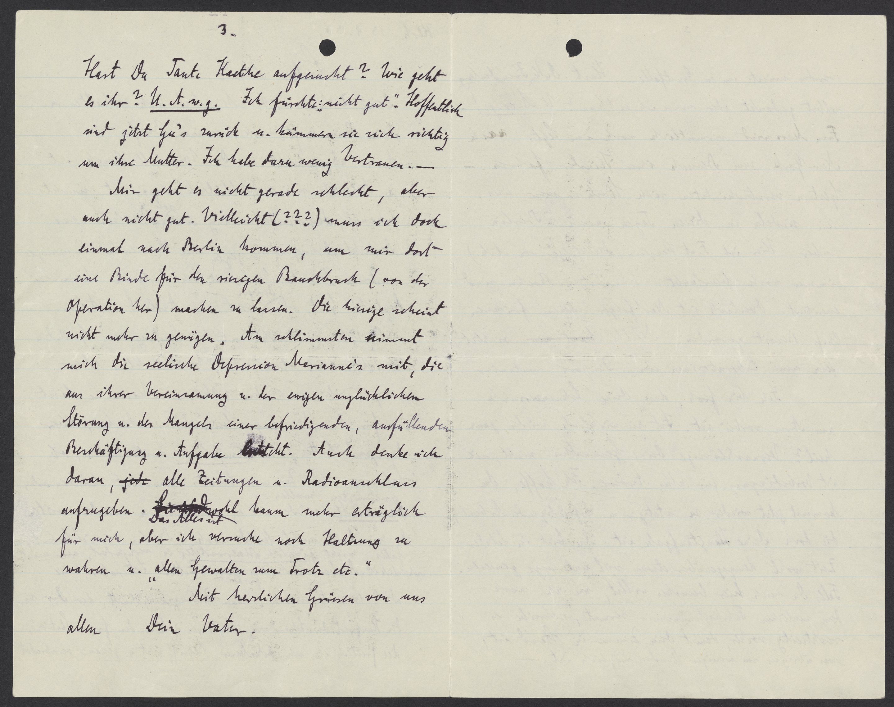 Ich bin froh, dass deine Sehnenzerrunk am Arm vorbei ist. Ist sie wirklich wieder ganz heil? Vernachlässige Deine Gesundheit nicht, sie ist Vorbedingung fuer alles Andere. Ich hoffe, Du kommst jetzt wieder zu stetiger u. befriedigende Arbeit, die doch Deine Hauptaufgabe ist. Du bist in letzter Zeit demgegenüber etwas viel unterwegs gewesen. Falls Du mich hier besuchen willst, wie ich nach dem neulichen Fahrkartenausweis vermute, schreibe es rechtzeitig vorher, damit Dein Zimmer in Stand ist, was übrigen in wenigen Stünden möglich ist. –