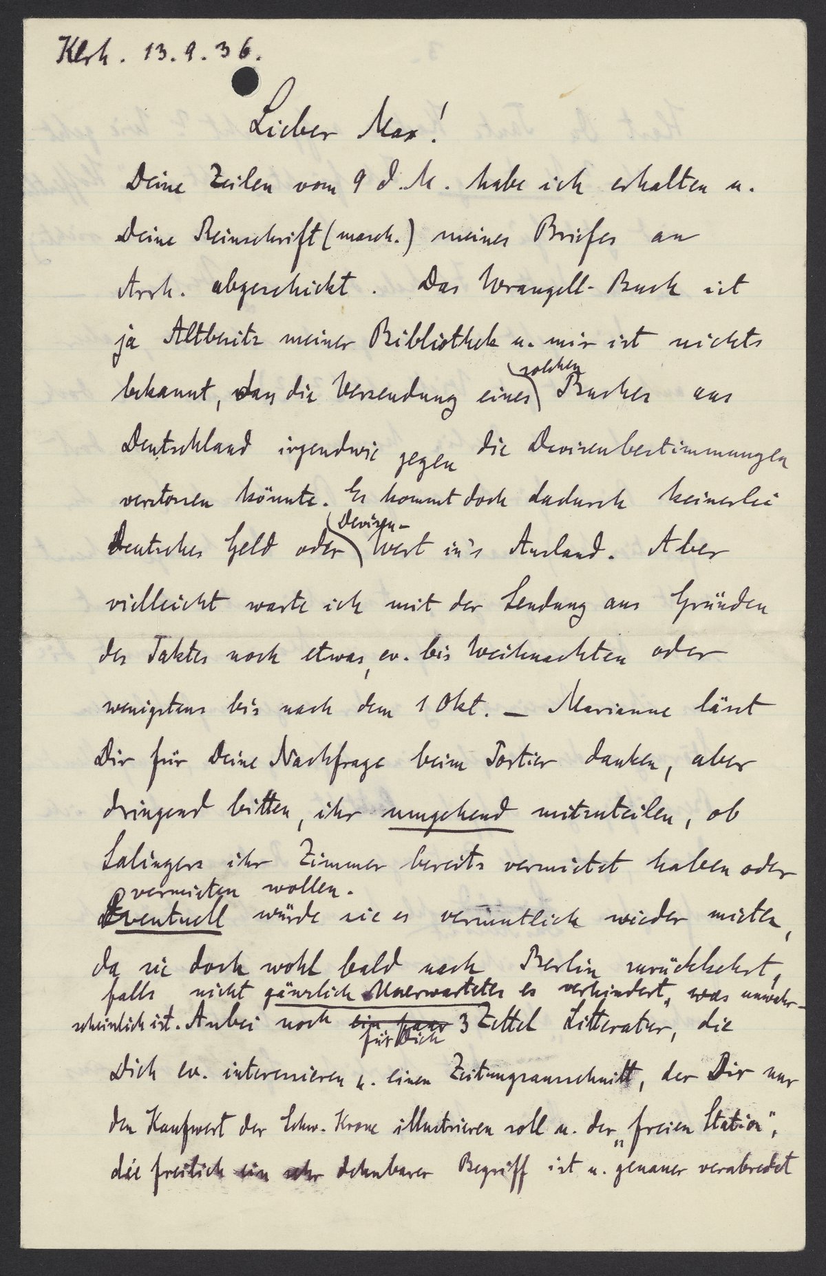 Deine Zeilen vom 9 d.M. habe ich erhalten u. Deine Reinschrift (march.) meines Briefes an Arrhenius abgeschickt. Das Wrangell-Buch ist ja Altbesitz meiner Bibliothek u. mir ist nichts bekannt, dass die Versendung eines solches Buches aus Deutschland irgendwie gegen die Devisenbestimmungen verstossen könnte. Es kommt doch dadurch keinerlei Deutsches Geld oder Devisen-Wert ins Ausland. Aber vielleicht warte ich mit der Sendung aus Gründen des Taktes noch etwas, ev. bis Weihnachten oder wenigstens bis nach dem 1. Okt. – Marianne lässt Dir für Deine Nachfrage beim Portier danken, aber dringend bitten, ihr umgehend mitzuteilen, ob Salingers ihr Zimmer bereits vermietet haben oder vermieten wollen.