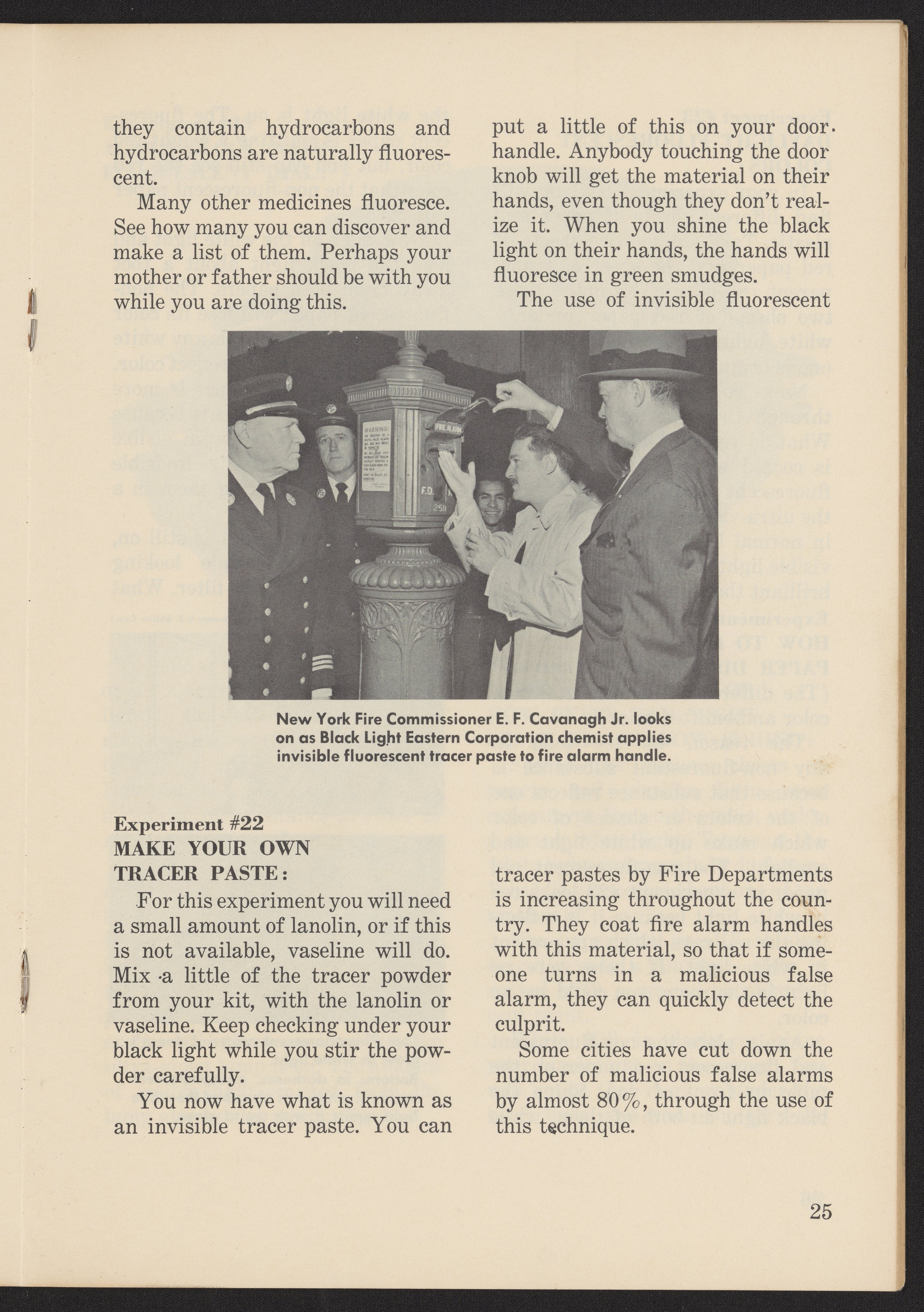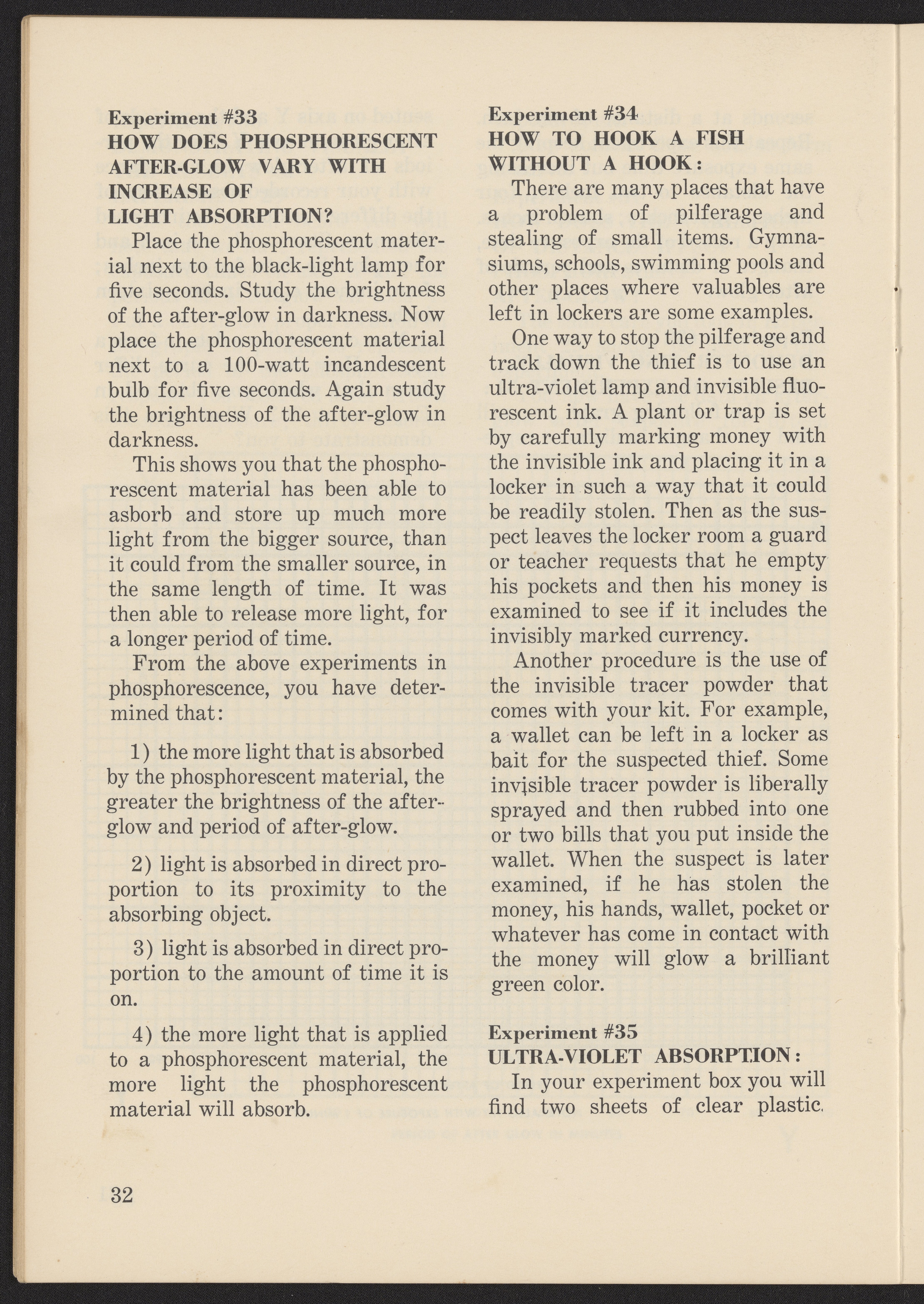 The box features two children using the set on the lid. The box contains: an instruction booklet titled "The Story of Black Light: The Unseen World Around Us; Over 40 Fascinating Experiments in Ultra-Violet Fluorescence", a UV lamp with stand, 3 mineral specimens, 4 vials of powder invisible fluorescent paints, 1 empty vial labeled 'invisible ink', an invisible fluorescent crayon, a vial of tracer powder and various other accoutrements for the instructed experiments.