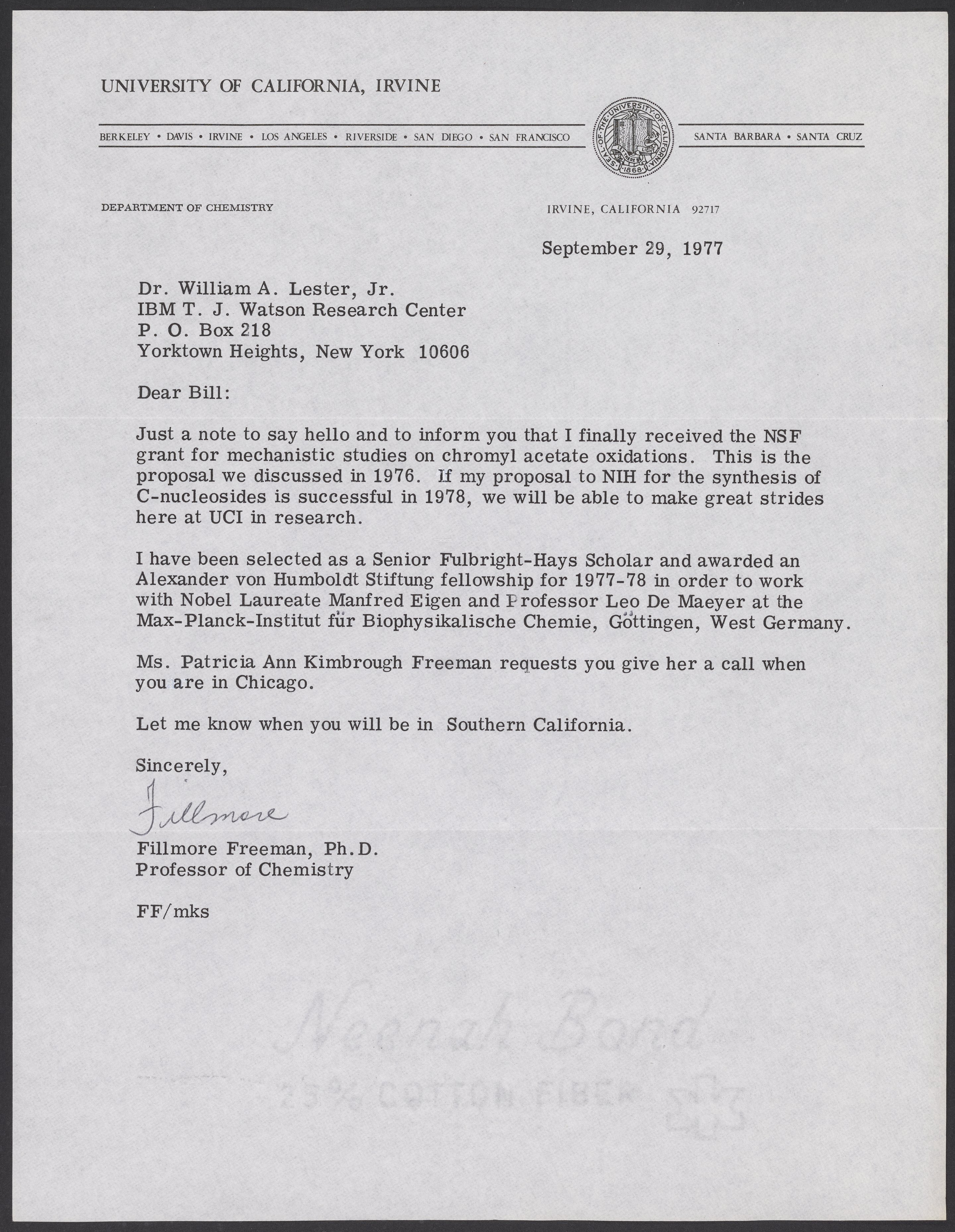 Freeman, Fillmore. “Letter to William A. Lester, Jr. from Fillmore Freeman, September 29, 1977,” September 29, 1977. William A. Lester, Jr. Papers, Box 1, Folder 28. Science History Institute. Philadelphia. https://digital.sciencehistory.org/works/lroxg9m.