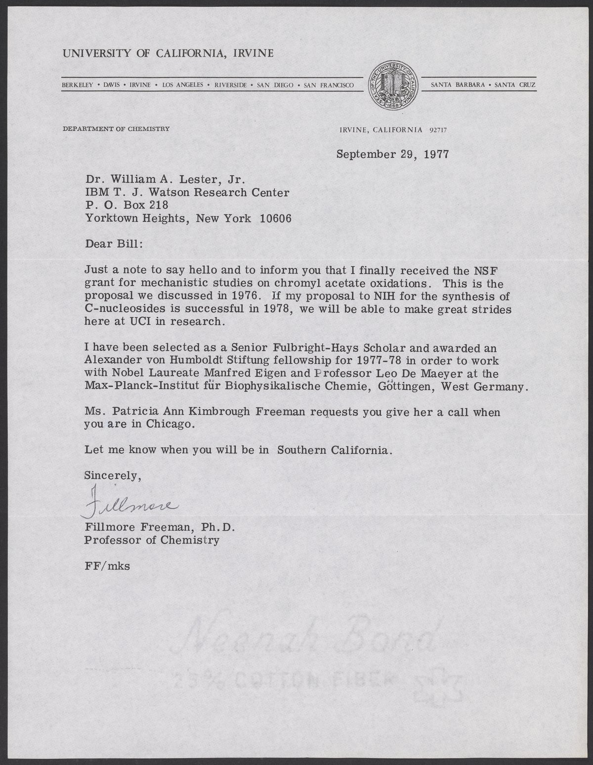 Letter to William A. Lester, Jr. from Fillmore Freeman, September 29, 1977