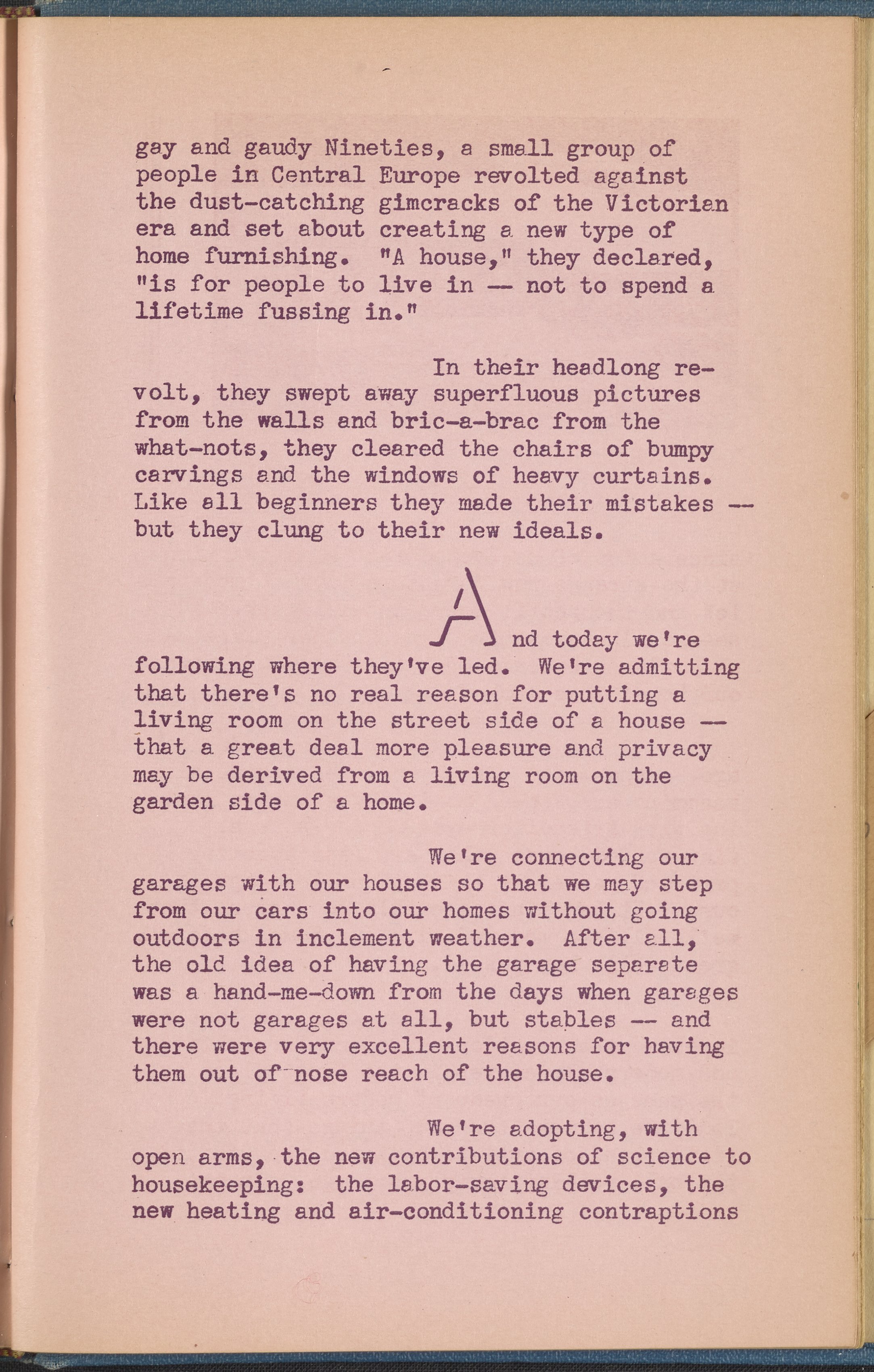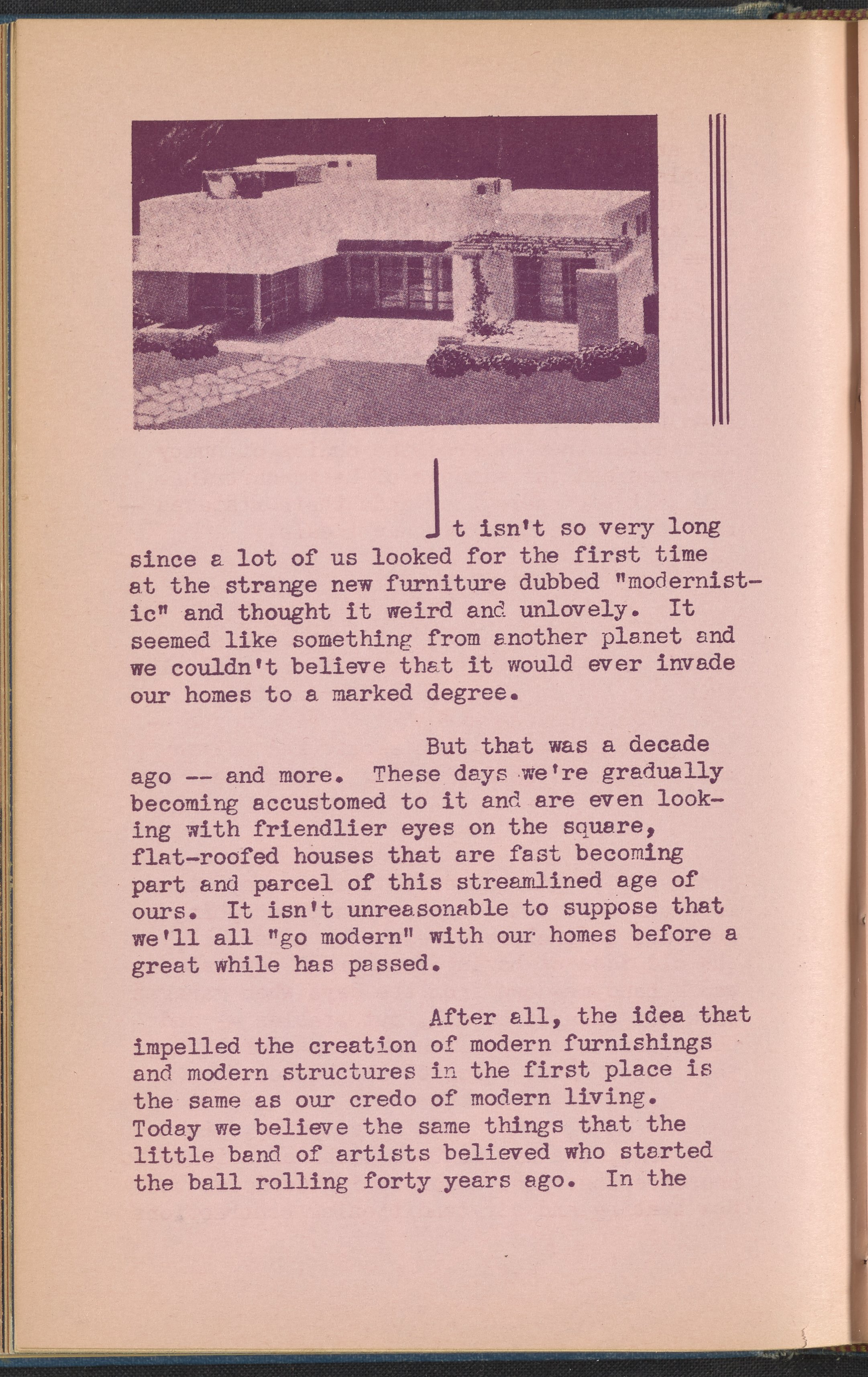 Booklet corresponding to a radio broadcast program created by the National Paint, Varnish, and Lacquer Association. The booklet discusses the styles and amenities that modern houses are afforded, "with utility, simplicity, and comfort as the keynotes." Continues to describe color schemes for modern homes and decoration trends in the modern style. Includes two monotone photographs and decorated covers.