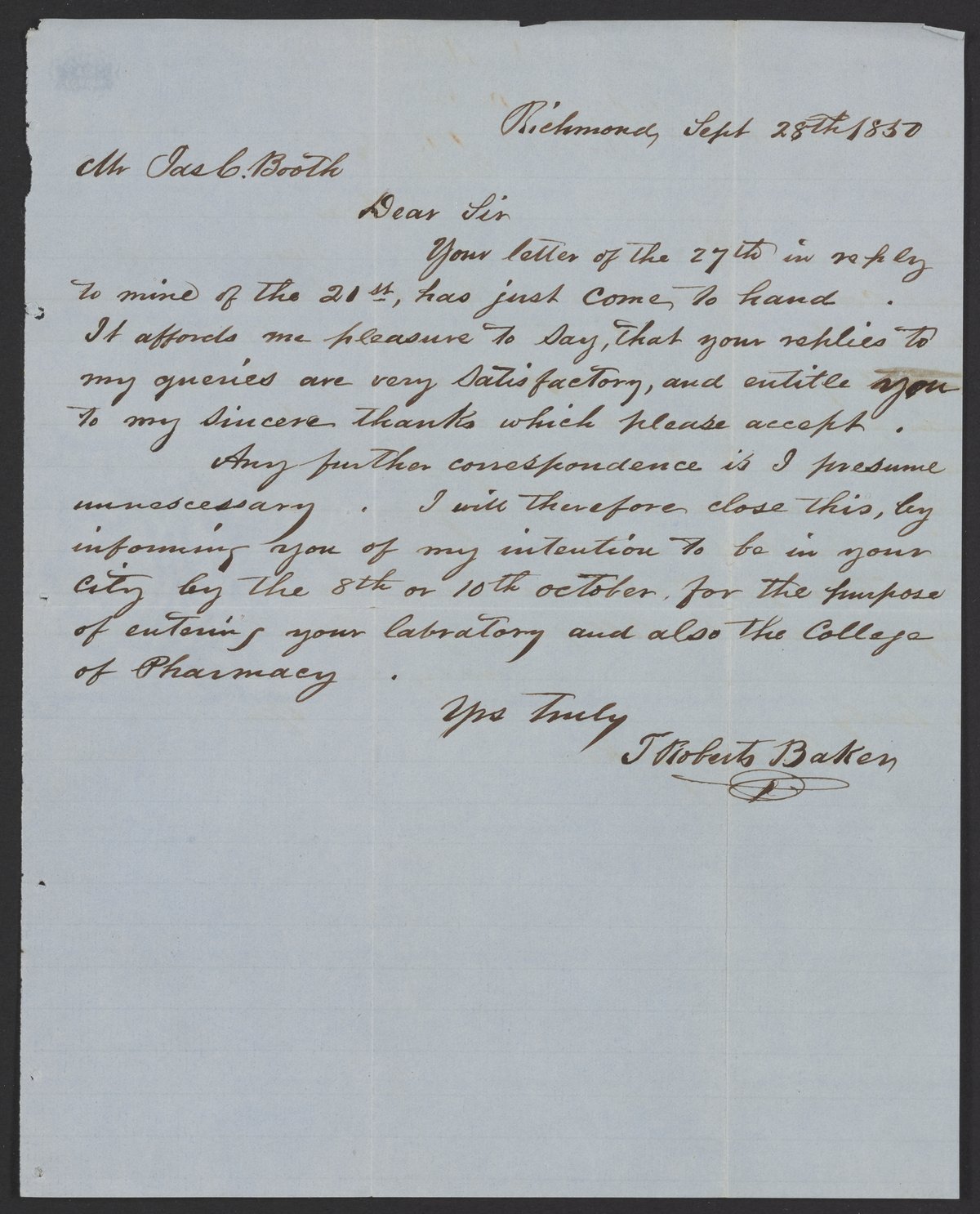 Letter from T. Roberts Baker to James Curtis Booth, September 28, 1850