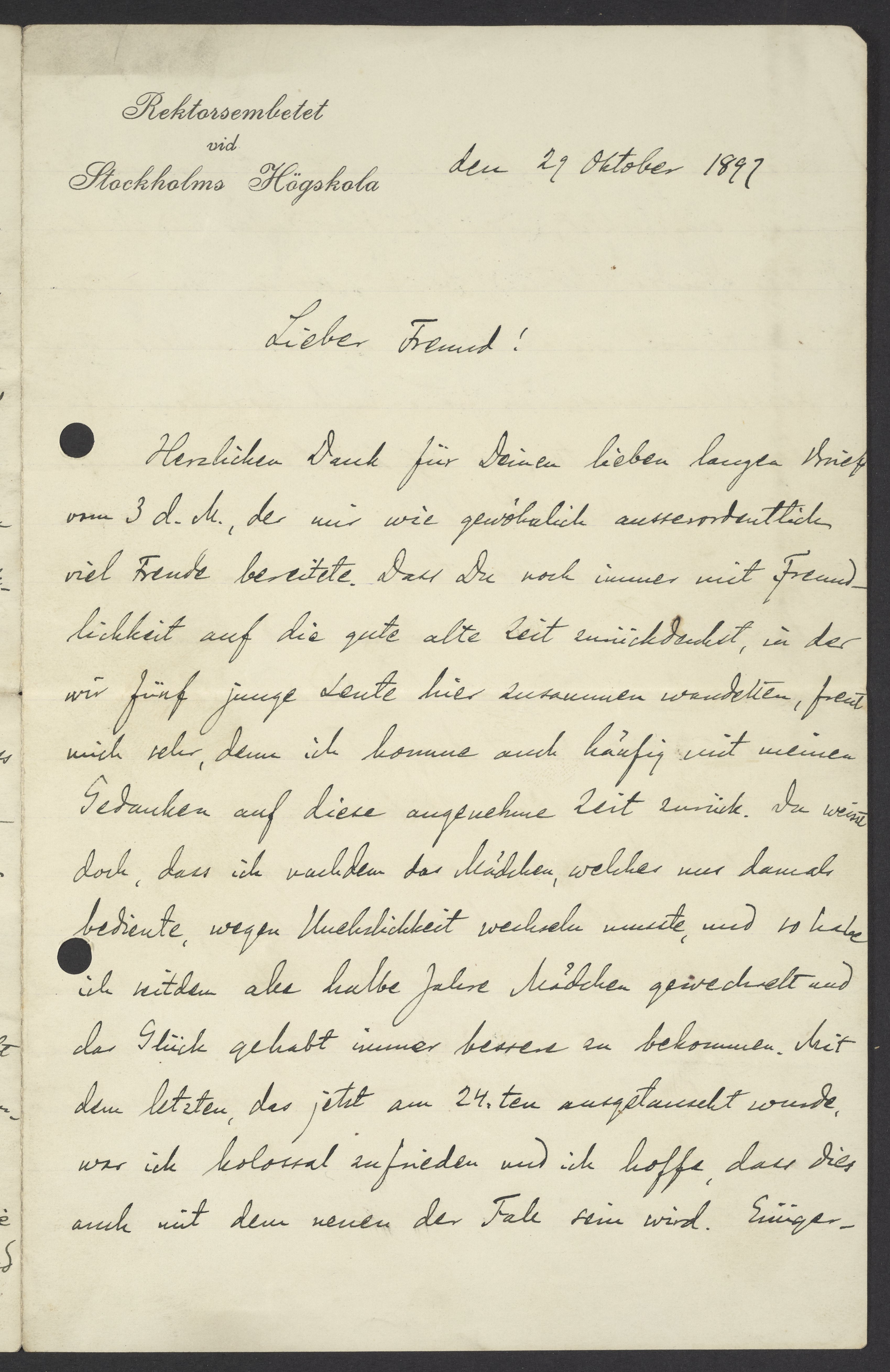 Letter from Svante Arrhenius to Georg Bredig, October 29, 1897
