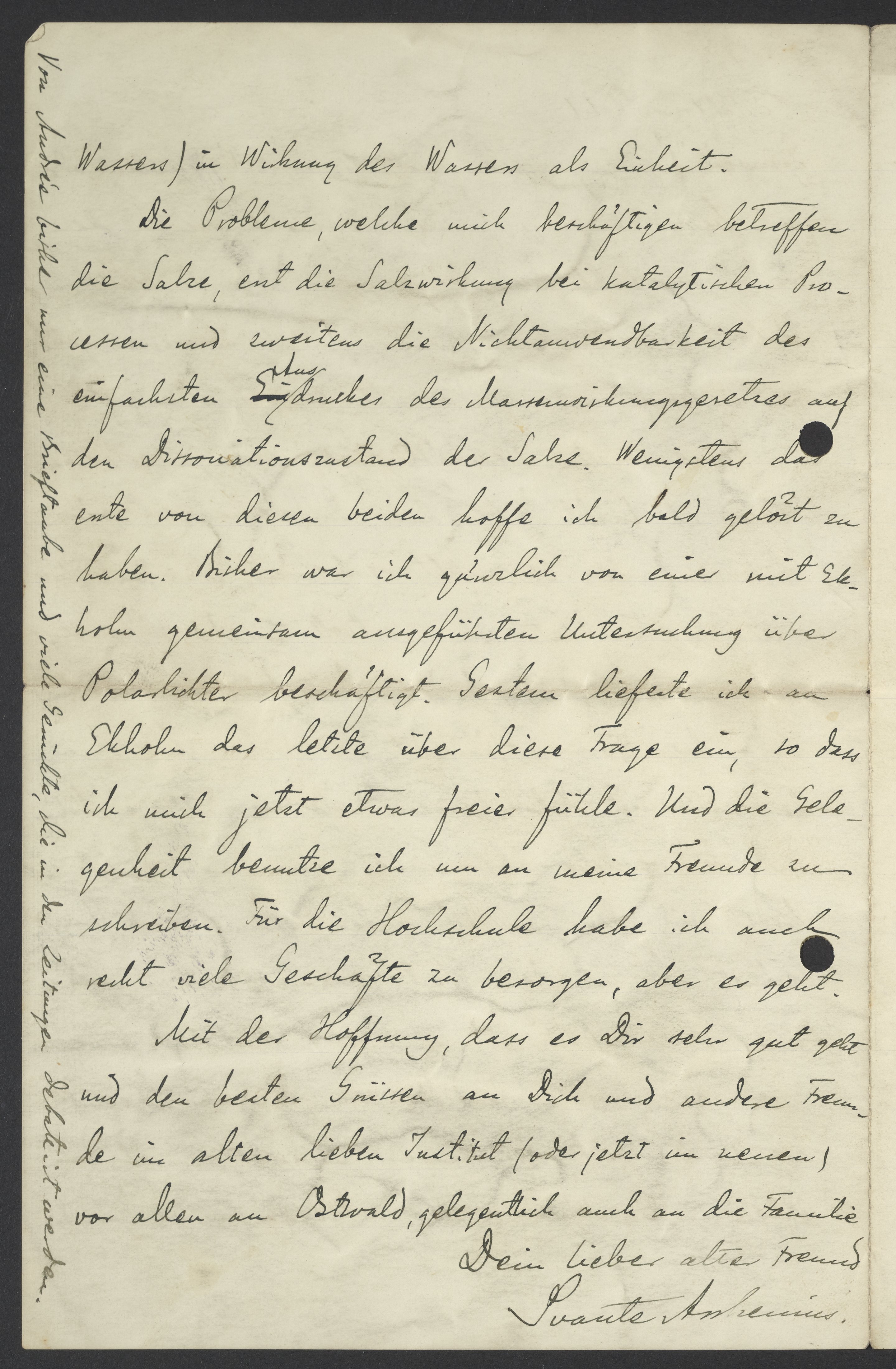 Die Probleme, welche mich beschäftigen betreffren die Salze, erst die Salzwirkung bei katalytischen Processen und zweitens die Nichtanwendbarkeit des einfachsten Ausdruckes des Mannerwirkungsgesetzes auf den Dissosationszustand der Salze. Wenigestens das erste von diesen beiden hoffe ich gelöst zu haben. Bisher war ich gänzlich von einer mit Ekholm gemeinsam ausgeführten Untersuchung über Polarlichter beschäftigt. Gestern lieferte ich an Ekholm das letzte über deine Frage ein, so dass ich jetzt mich freier fühle. Und die Gelegenheit benutzte ich um meine Freunde zu schreiben. Für die Hochschule habe ich auch recht viele Geschäfte zu besorgen, aber es geht.
