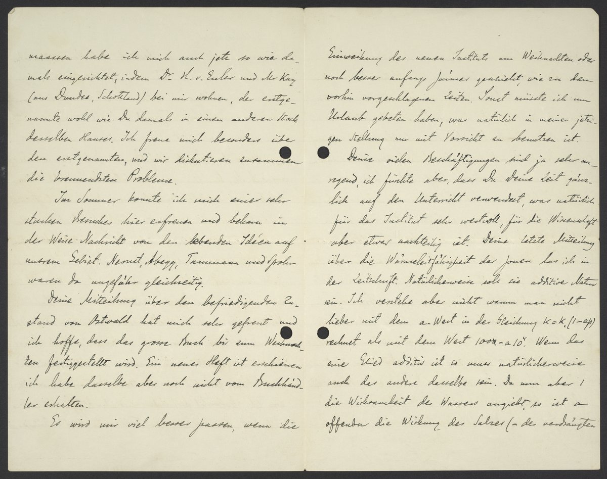 Deine vielen Beschäftigungen sind ja sehr erregend, ich fürchte aber, dass Du Deine Zeit gänzlich auf den Unterricht verwendest, was natürlich für das Institut sehr wertvoll, für Wissenschaft aber etwas nachteilig ist. Deine letzte Mitteilung über die Wärmeleitfähigkeit der Ionen las ich in der Zeitschrift. Natürlicherweise soll sie additive Natur sein. Ich verstehe aber nicht warum man lieber mit dem a. Wert in der Gleichung k = k (1-ap) rechnet als mit dem Wert 100∅-a104. Wenn das eine Glied additiv ist so muss natürlicherweise auch das andere dasselbe sein. Da man aber die Wirksamkeit des Wassers, so ist es offenbar die Wirksamkeit des Salzes (-des verdrängten Wassers) in Wirkung des Wassers als Einheit.