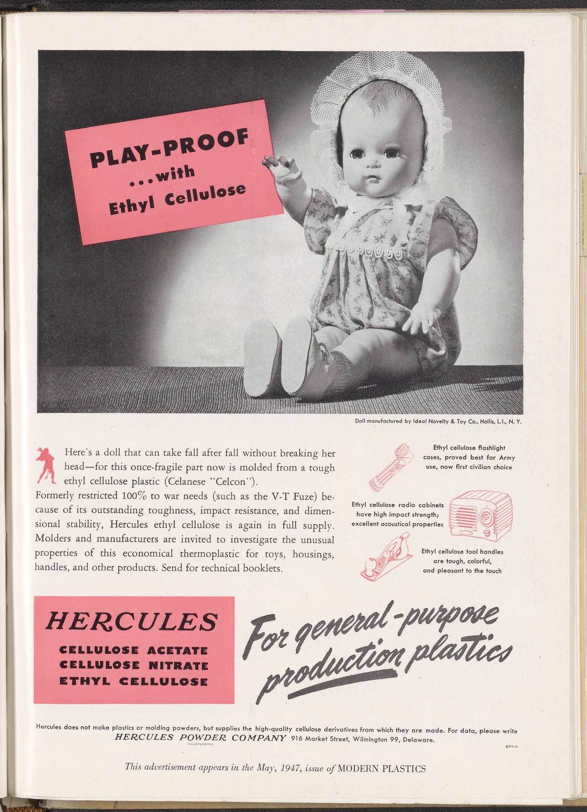 Hercules Incorporated. “Play Proof... with Ethyl Cellulose.” 1947 Hercules Advertisements, 1947. Records of Hercules Incorporated, Volume 1947. Science History Institute. Philadelphia. https://digital.sciencehistory.org/works/lyadnqj.