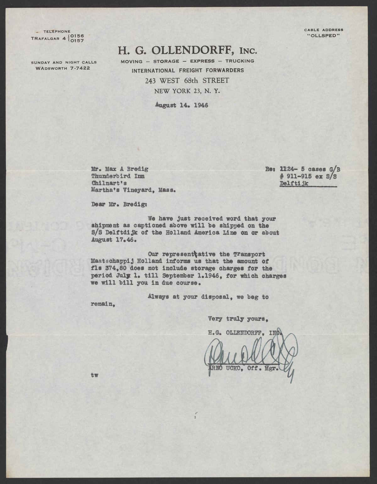 H. G. Ollendorff, Inc., an international shipping company, informs Max Bredig (1902-1977) that his shipment will be sent from Holland. Bredig will be billed for additional storage costs.