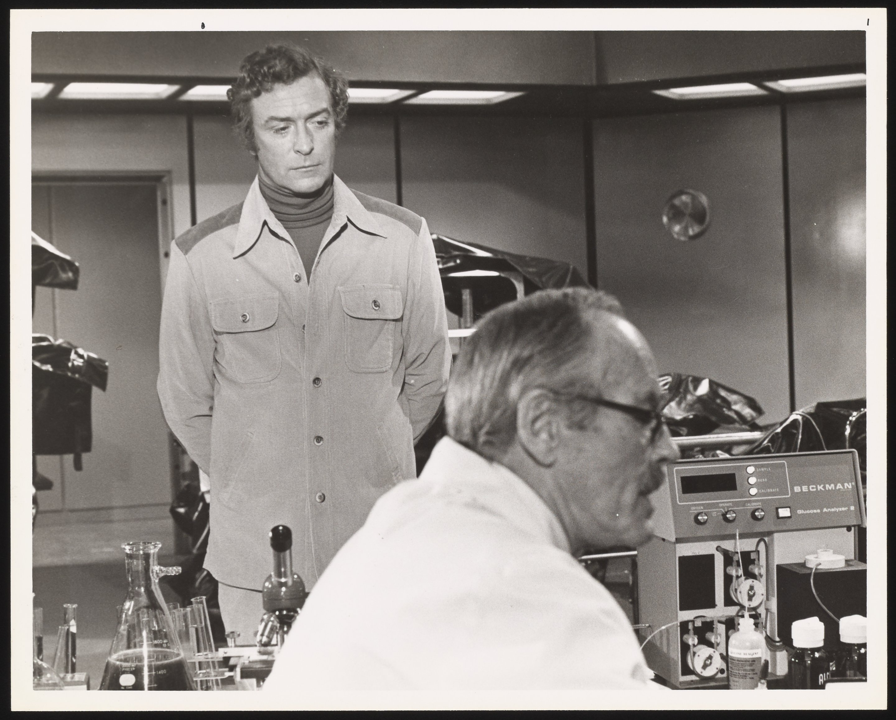 Michael Caine and a Beckman Glucose Analyzer on the set of The Swarm
