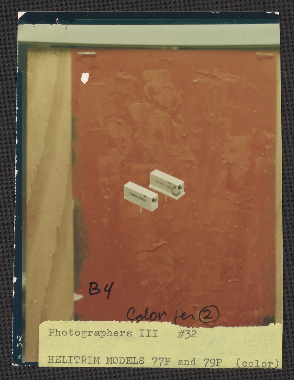 Photographers III. “Helitrim Models 77P and 79P Trimming Potentiometers against an Orange Background,” 1960–1979. Beckman Historical Collection, Box 85. Science History Institute. Philadelphia. https://digital.sciencehistory.org/works/m039k539b.