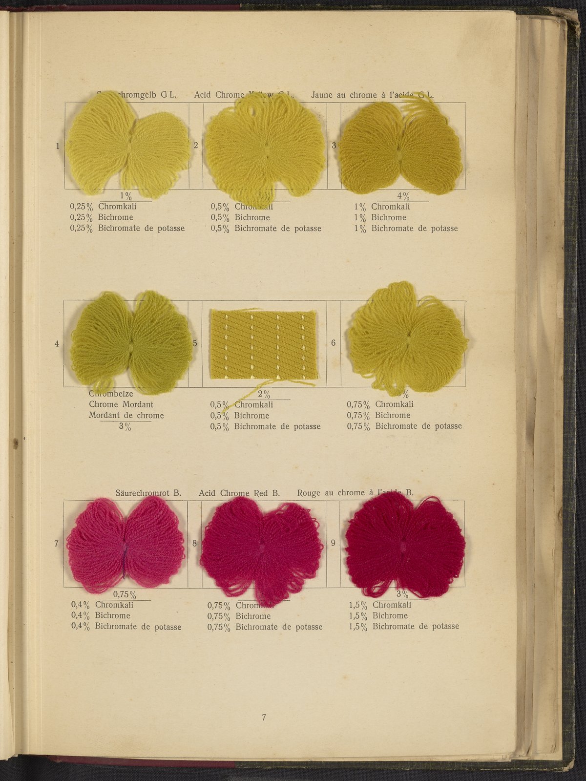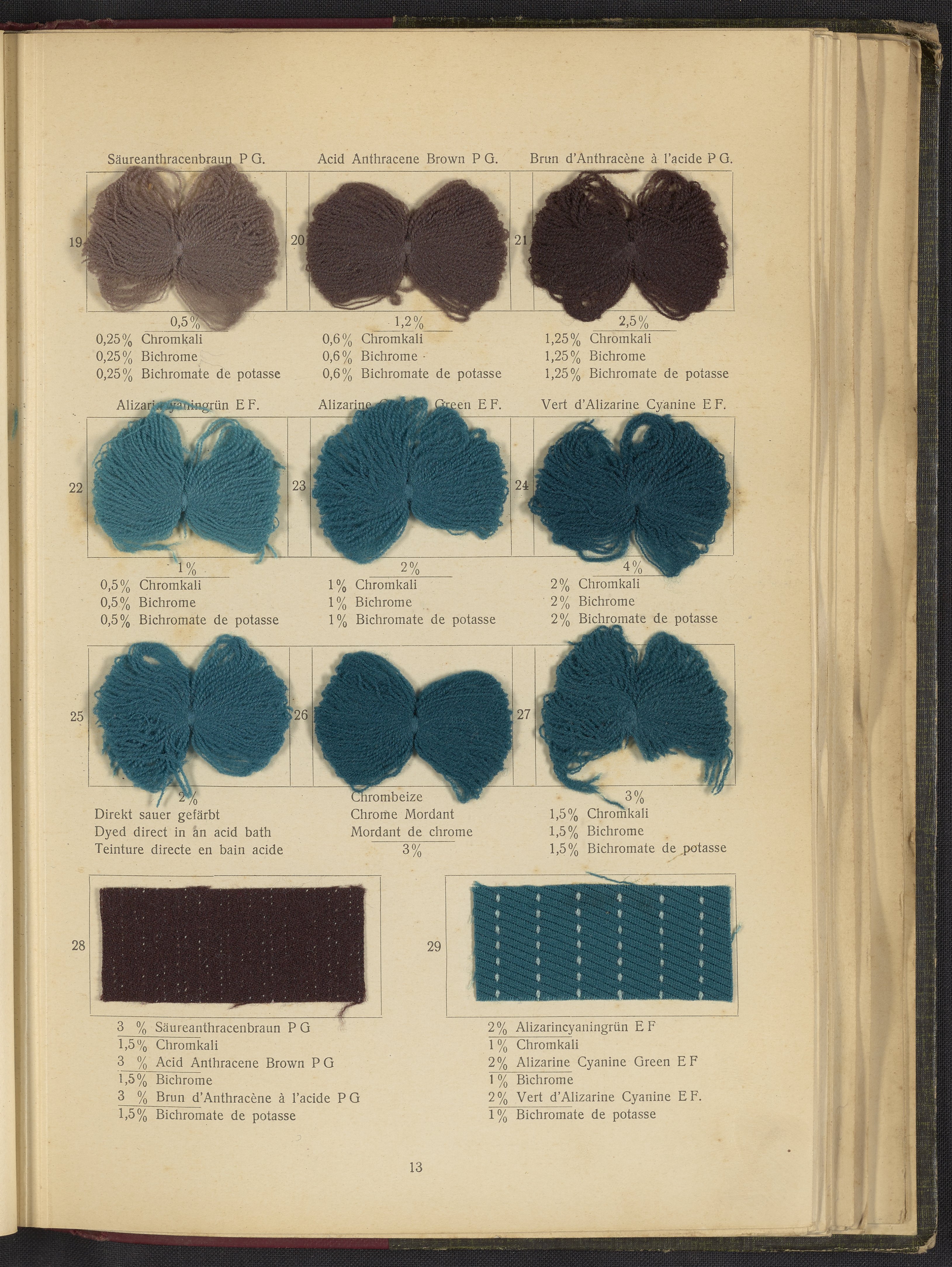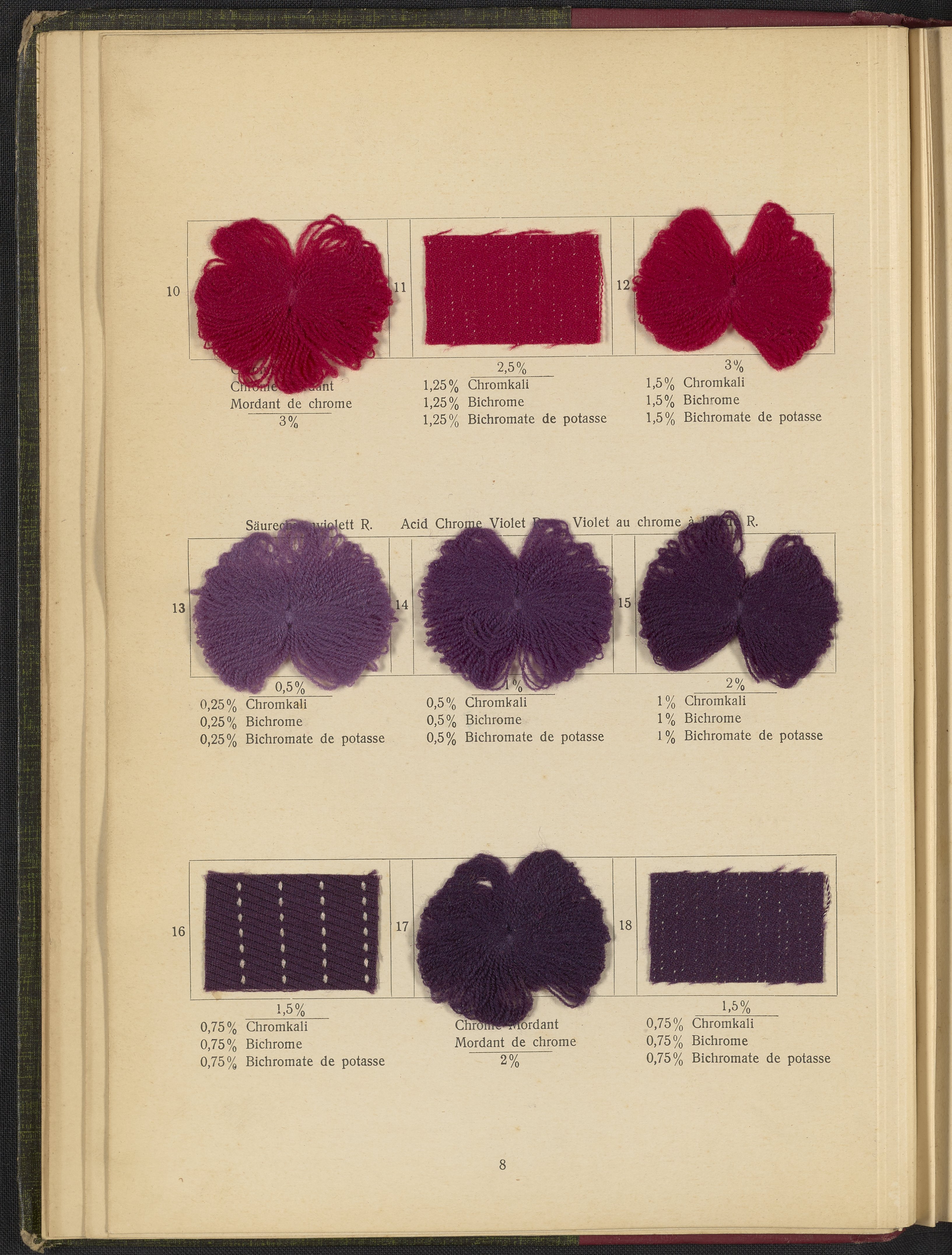 This tri-lingual work, digitized in full, contains dyeing instructions and 101 dyes textile samples.
