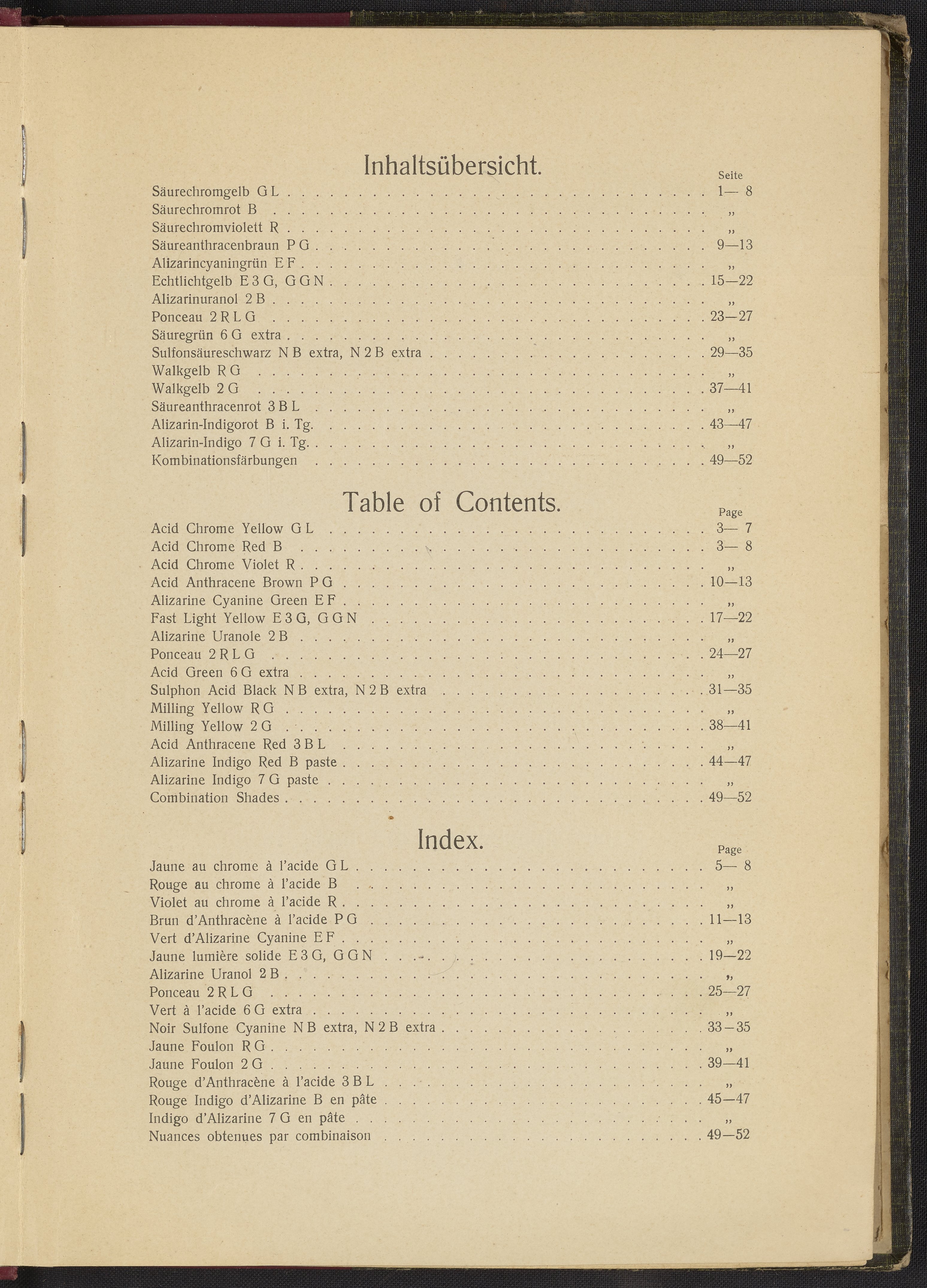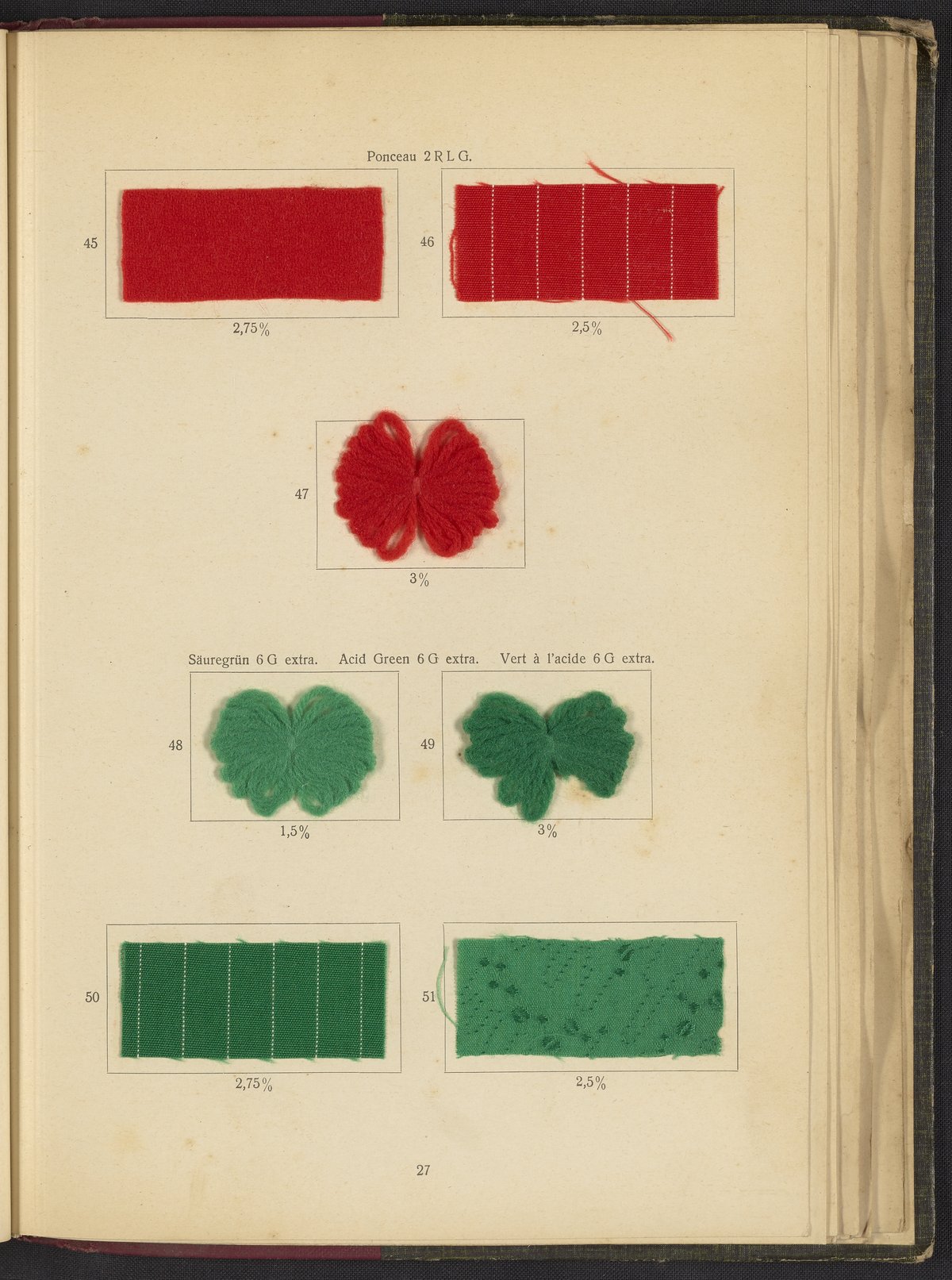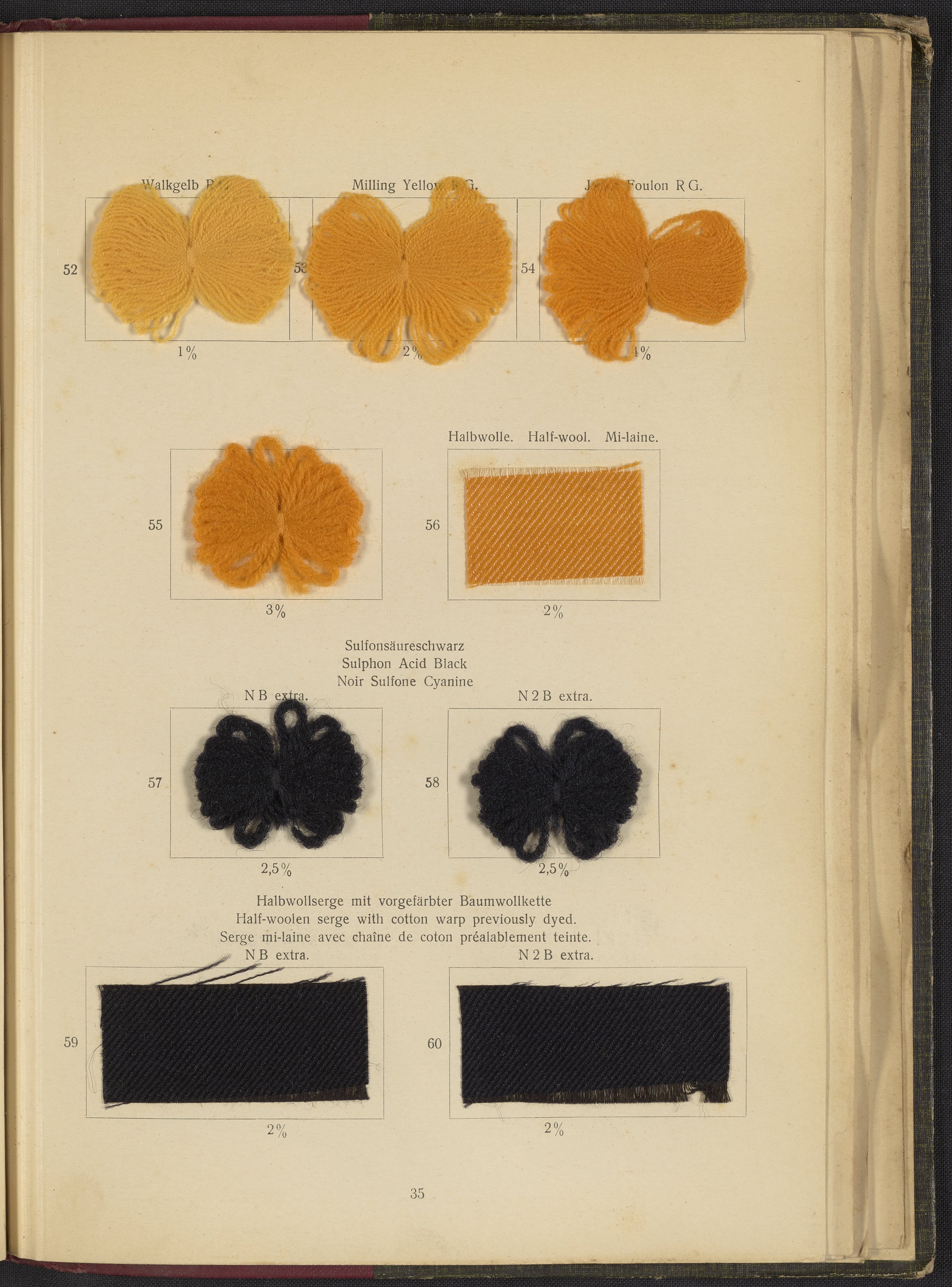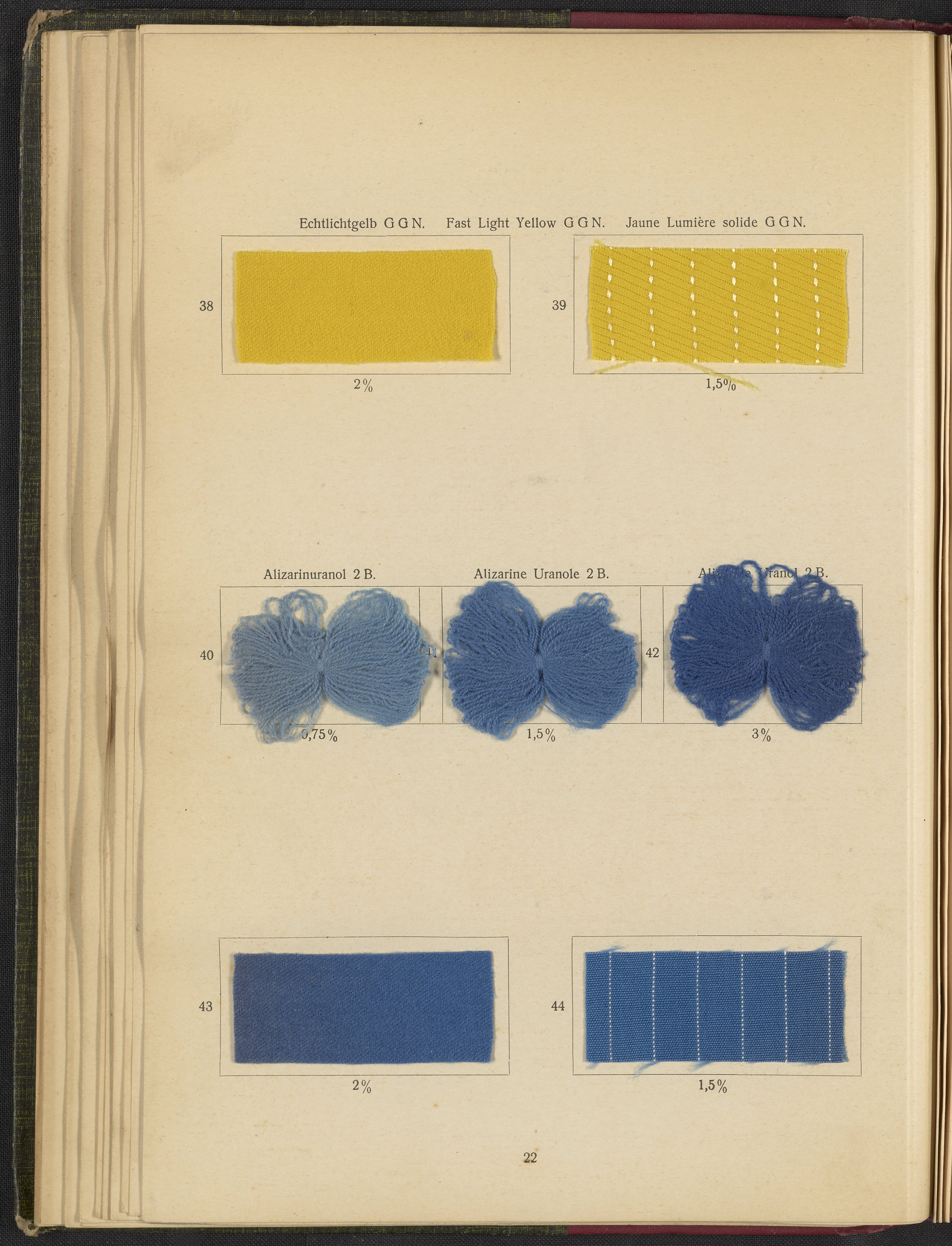 This tri-lingual work, digitized in full, contains dyeing instructions and 101 dyes textile samples.