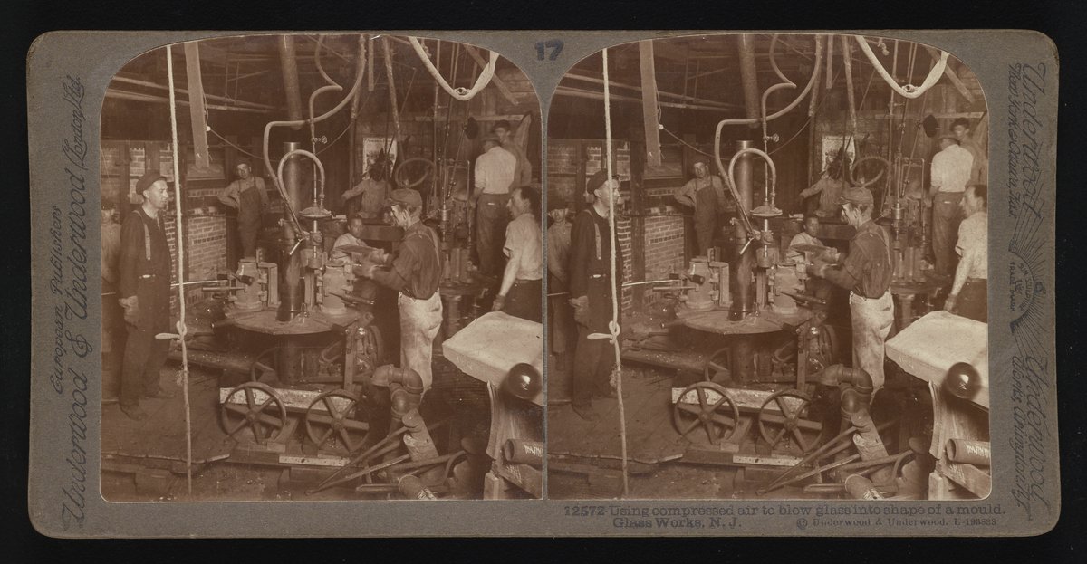“Using Compressed Air to Blow Glass into Shape of a Mould.” Underwood & Underwood, n.d. Underwood & Underwood Stereographs of Manufacturing Industries. Science History Institute. Philadelphia. https://digital.sciencehistory.org/works/m326m172d.